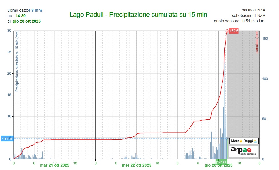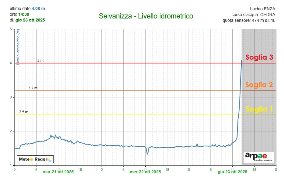 Preoccupa un po' l'improvviso innalzamento del torrente Enza nel suo alto corso. Il temporale sta raggiungendo il suo culmine e la zona a confine tra reggiano, parmense e Toscana ha visto più di 100 mm di pioggia in poco tempo. Valori sufficienti a far crescere di molto i livelli degli affluenti dell'Enza sia nel parmense che nel reggiano a Succiso.