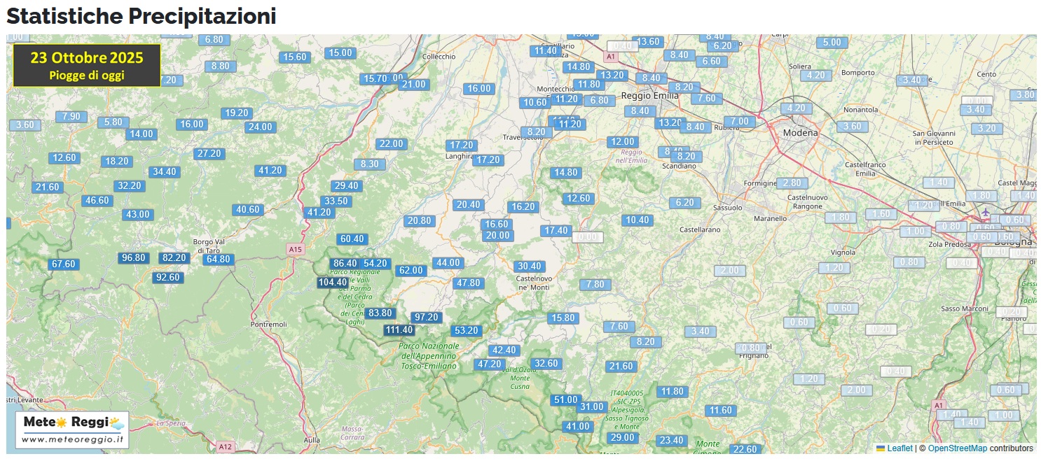 Ecco cosa ci dicono al momento i pluviometri reggiani (valore assolutamente parziale):