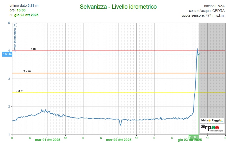 Il torrente Enza dopo un picco oltre soglia 3 fa registrare una flessione lieve che l'ha riportato a soglia 2 e vedremo come si comporterà quando questa onda raggiungerà le stazioni più a valle a Vetto.