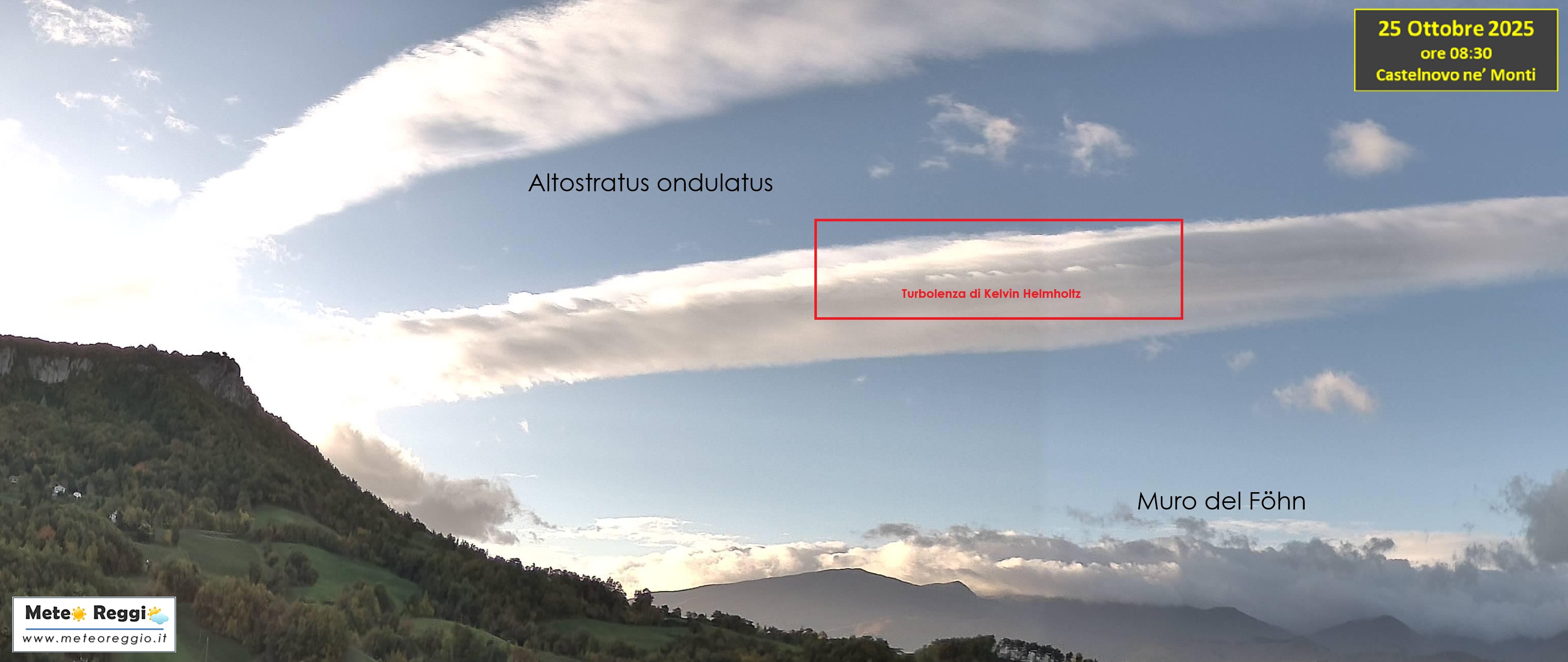 -> Turbolenza di Kelvin-Helmholtz: Evidenziata nel riquadro rosso, questa è una formazione nuvolosa rara e spettacolare che si sviluppa lungo la superficie di separazione tra due strati d'aria che scorrono a velocità significativamente diverse (o con un forte "shear" del vento). La forma ricorda le creste delle onde marine che si rompono, e indica una forte instabilità dinamica e intensa turbolenza tra gli strati, spesso associata proprio alle onde orografiche e ai forti venti di Föhn in quota.