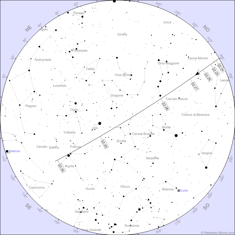 La serata proseguirà sotto il segno del cielo sereno, della Luna crescente e di un bel passaggio della Stazione Spaziale Internazionale alle 22:28 quando transiterà sulla nostra testa luminosissima.