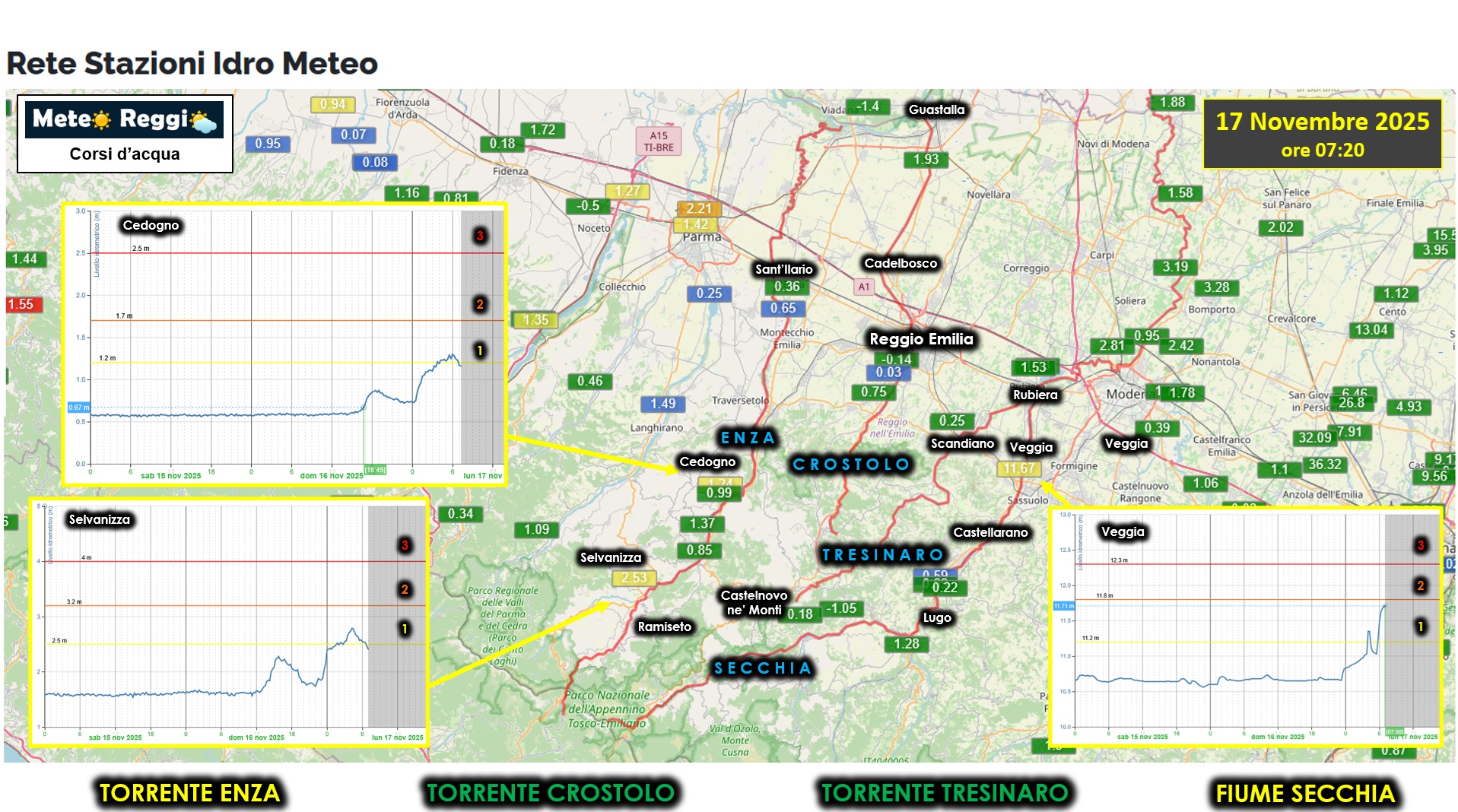 Il torrente maggiormente esposto a questo genere di affondi instabili, ovvero, quelli in arrivo da Liguria/Toscana. Nella notte abbiamo visto un paio di onde di piena sopra soglia 1, specie alle 04:15, ma l'incostanza dell'intensità piovosa ha fatto sì che vi fossero pause sufficienti a tenere sotto controllo tale livello. Attualmente il modesto colmo di piena si trova a Selvapiana in direzione di Ciano d'Enza. Monitoraggio attivo, ma nessuna minaccia concreta al momento.
