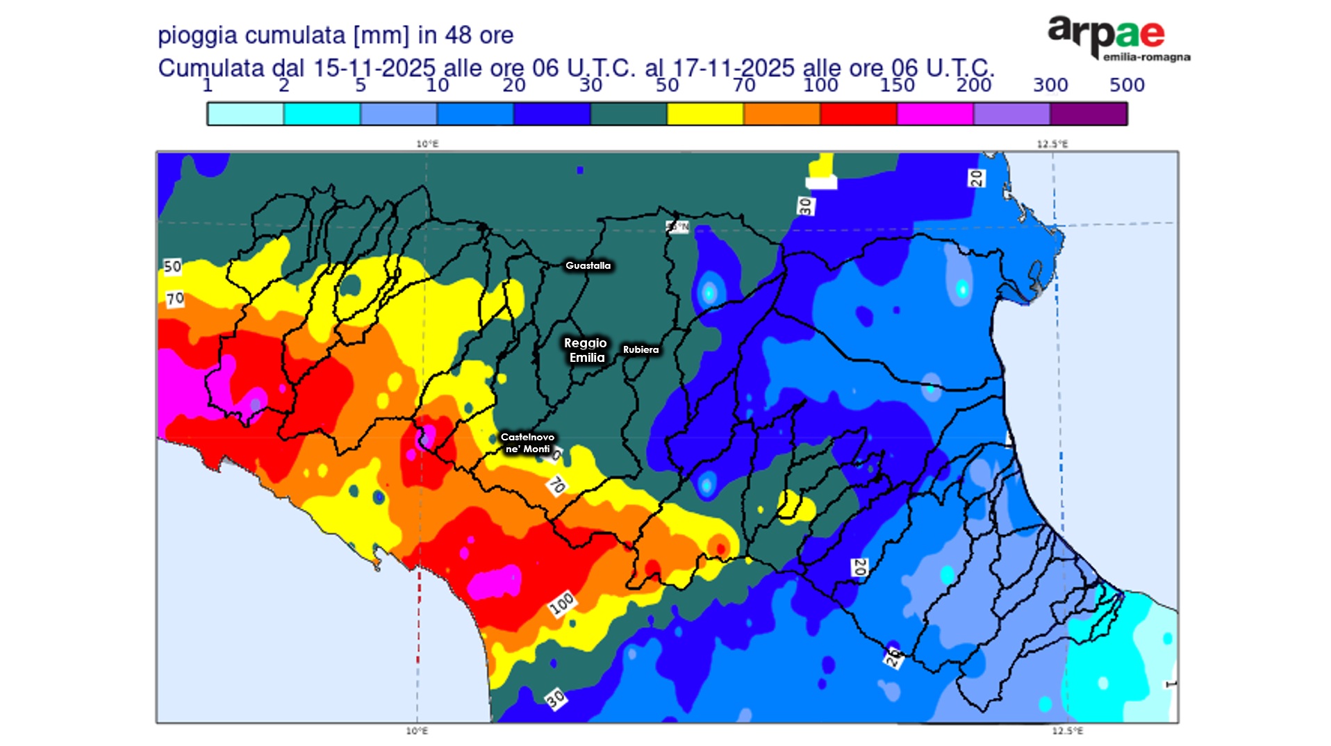 Accumuli che da inizio perturbazione 24 ore fa ha portato ben 44 mm di pioggia su Reggio Emilia che tradizionalmente resta spesso in ombra. In alta montagna gli accumuli superano ormai i 70/80 mm e ciò ha avuto qualche riflesso sui corsi d'acqua maggiori che scendono proprio da quelle zone.