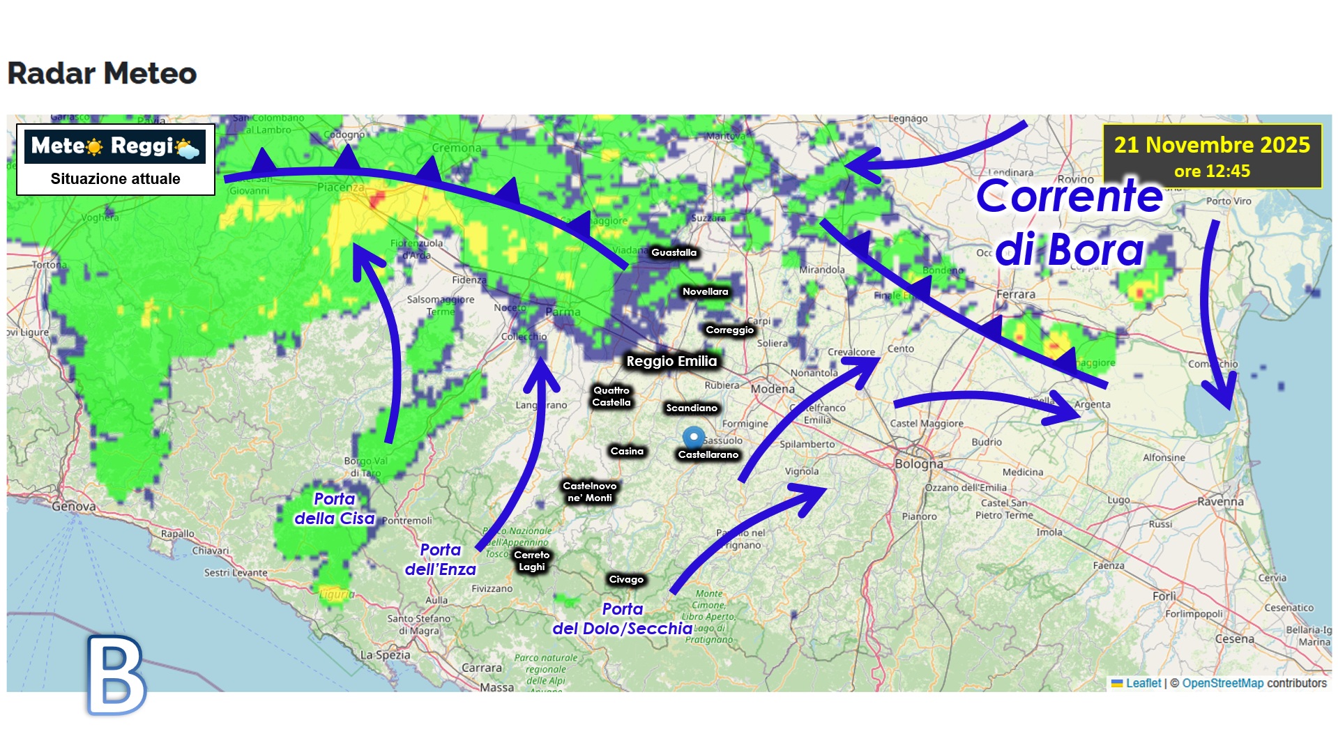 Scontro tra corrente d'aria fredde sulle nostre teste. Da un lato la bassa pressione formatasi per l'ingresso di aria Artica nel Mediterraneo dal sud della Francia che ruota in senso antiorario al largo della Liguria e della Toscana. Questa risalendo si scontra con l'Appennino e trova spazio solo nei valichi montani preferendo il fianco parmense/piacentino più permeabile del reggiano. Dall'altro la porta della Bora che si è aperta ed entra nel catino Padano richiamata proprio da quel vortice che ruota nell'alto Tirreno.