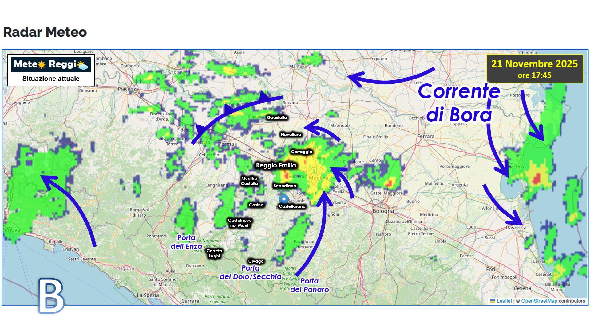 Prende vigore un nucleo di piogge tra il comprensorio ceramico e la Via Emilia, tra le province di Reggio Emilia e Modena. Un nucleo che scende dalle valli di Panaro e Secchia incontrando le correnti di Bora a nord-est che ne alimentano la formazione.