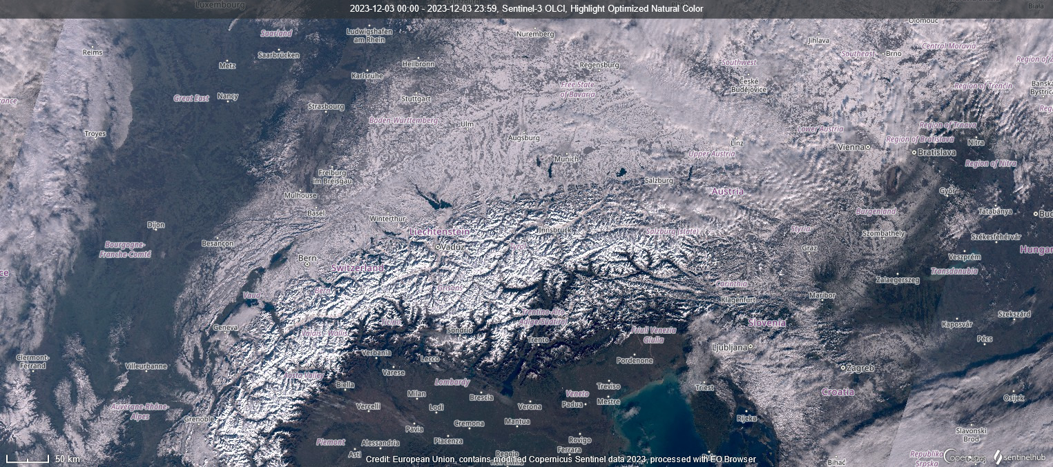 Vediamo chiaramente le Alpi coperte di abbondante neve, ma anche le ampie pianure della Germania completamente coperte di bianco.