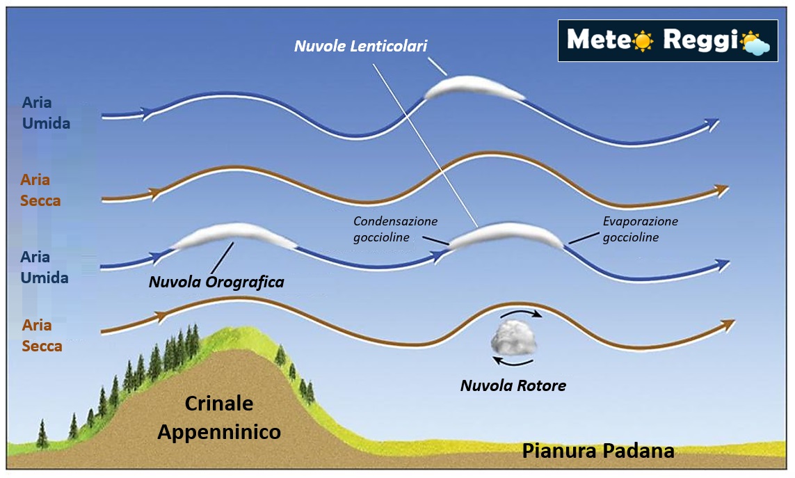 Le nuvole Altocumulus lenticolari si formano quando l'aria umida si solleva sopra gli ostacoli montuosi, raggiunge il livello di saturazione e forma nuvole. Queste nuvole possono apparire stazionarie sopra la cima di una montagna, anche quando il vento soffia attraverso di esse, creando una serie di lenti che sembrano impilate l'una sull'altra.