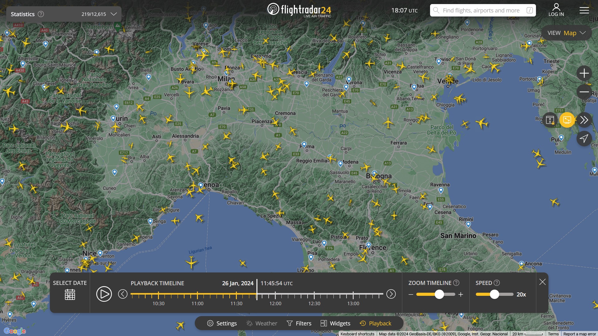 L'umidità iniziava attorno ai 9.000 metri per terminare oltre i 12.000 metri, una zona del cielo estremamente trafficata dalle linee aeree che mettono in comunicazione l'Europa e l'America con l'Asia ed il Medio Oriente (immagine FlightRadar24).
