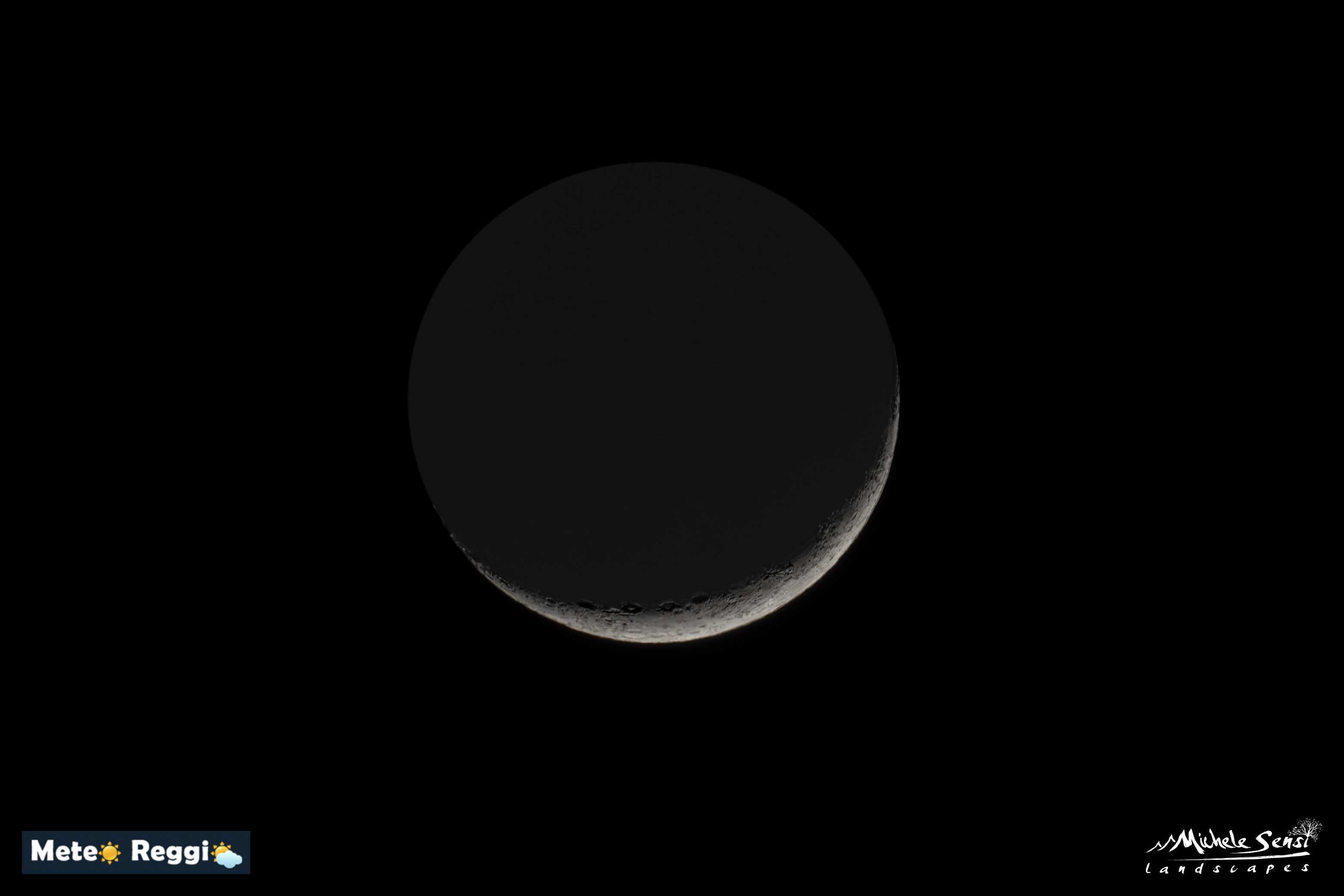 Un'ampia area grigia cenere si apre alle spalle del piccolo falcetto del nostro satellite naturale che brilla di luce diretta.