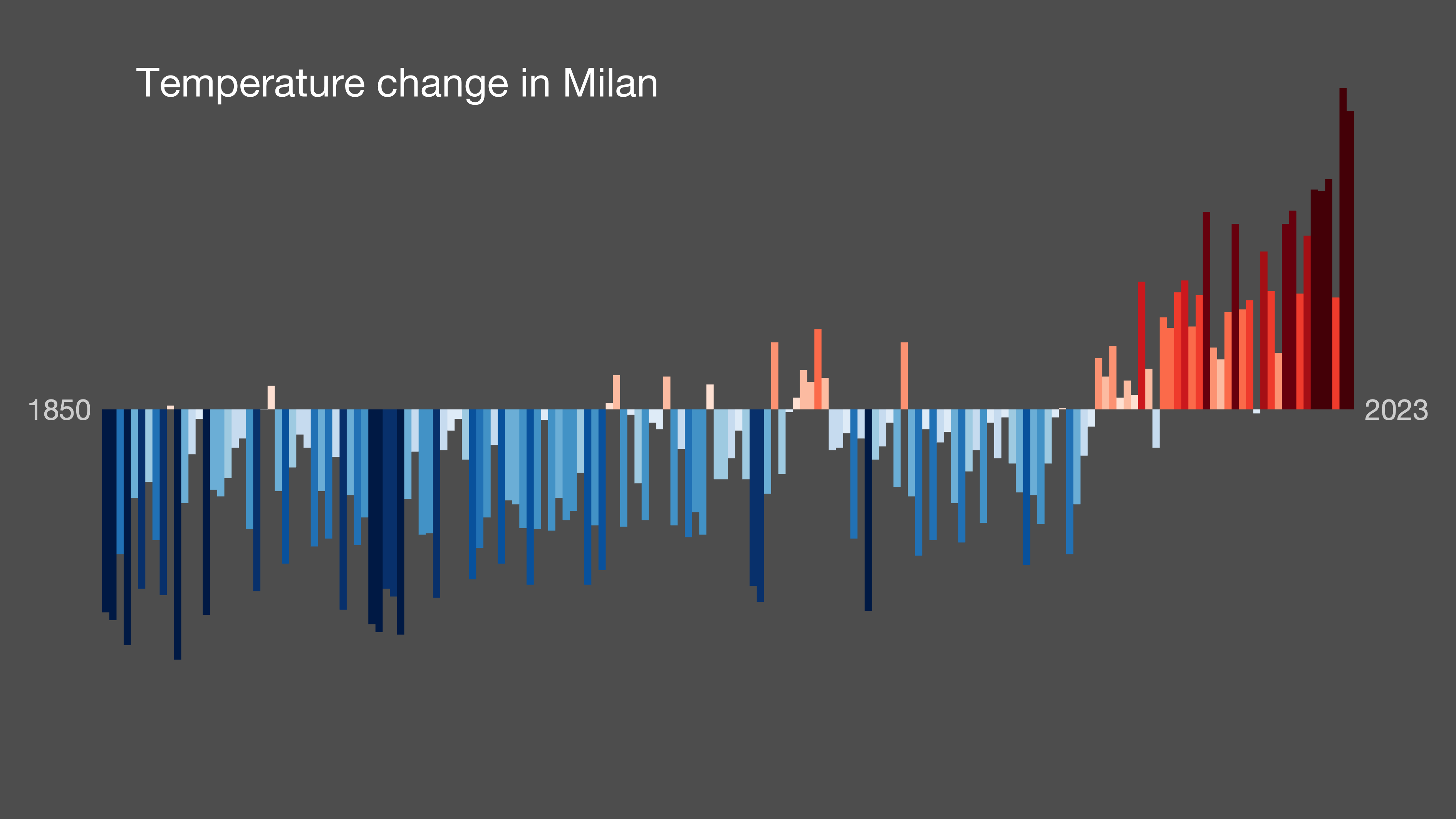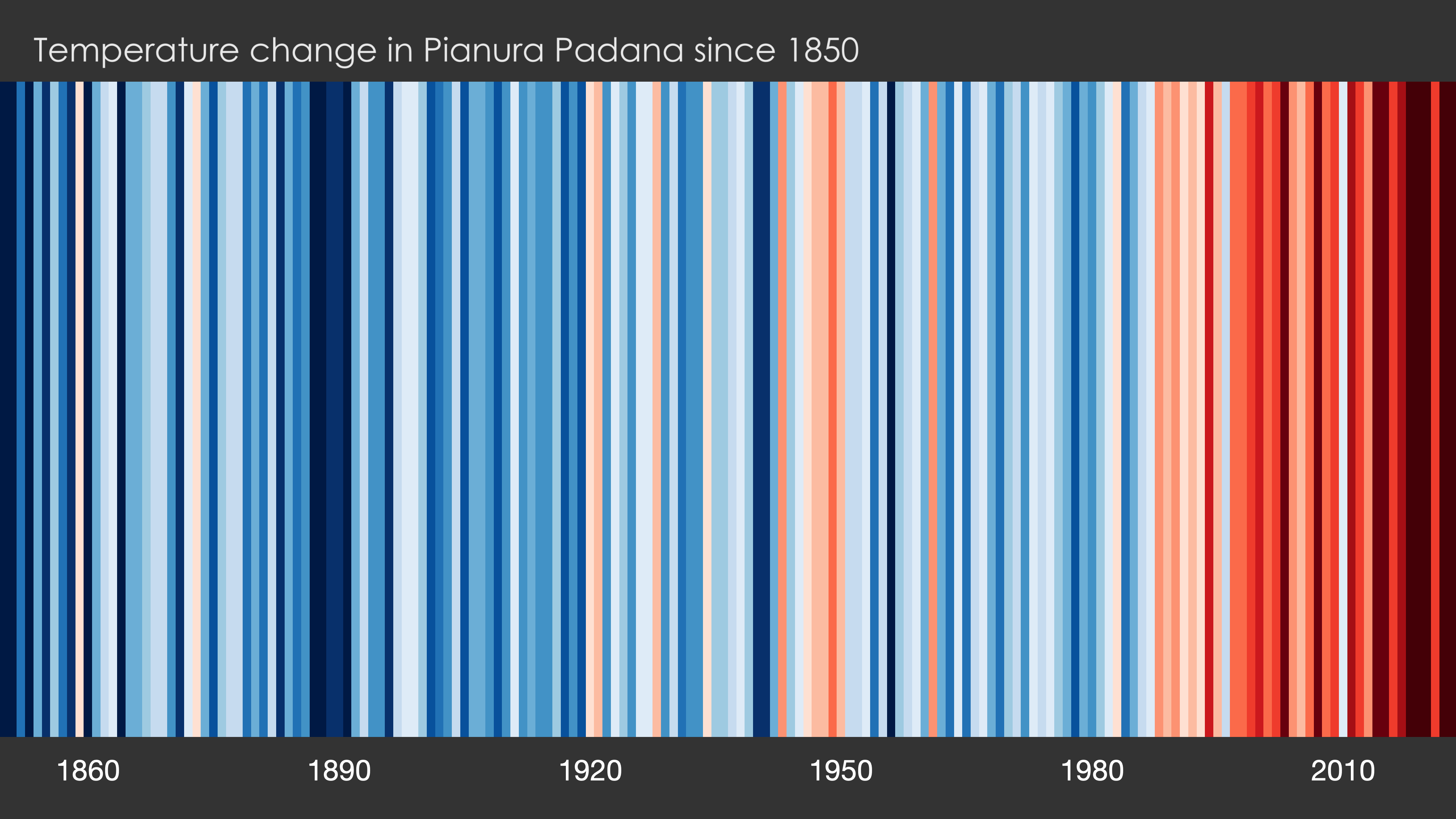 Le Warming Stripes sono un grafico a barre che mostra l'andamento della temperatura media annuale in una determinata regione o a livello globale dal 1850 ad oggi. Ogni striscia rappresenta un anno e il colore varia dal blu per le temperature più basse al rosso per quelle più alte.