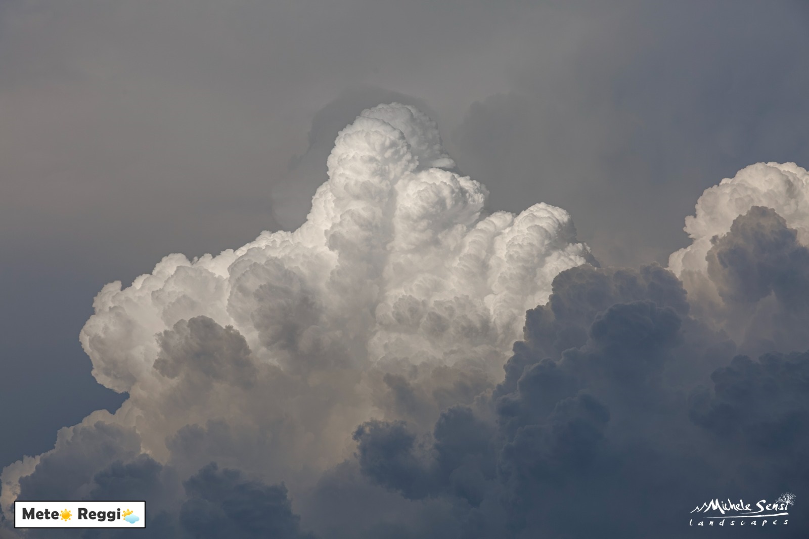 > Il Cumulonimbus calvus ha una parte superiore gonfia e arrotondata, simile a quella dei cumuli più sviluppati, e si presenta spesso come una grande torre di nubi con bordi relativamente netti. Tuttavia, a differenza dei cumuli, la sommità del Cumulonimbus calvus inizia a perdere i contorni ben definiti, mostrando segni di crescita e transizione verso uno stato più avanzato.