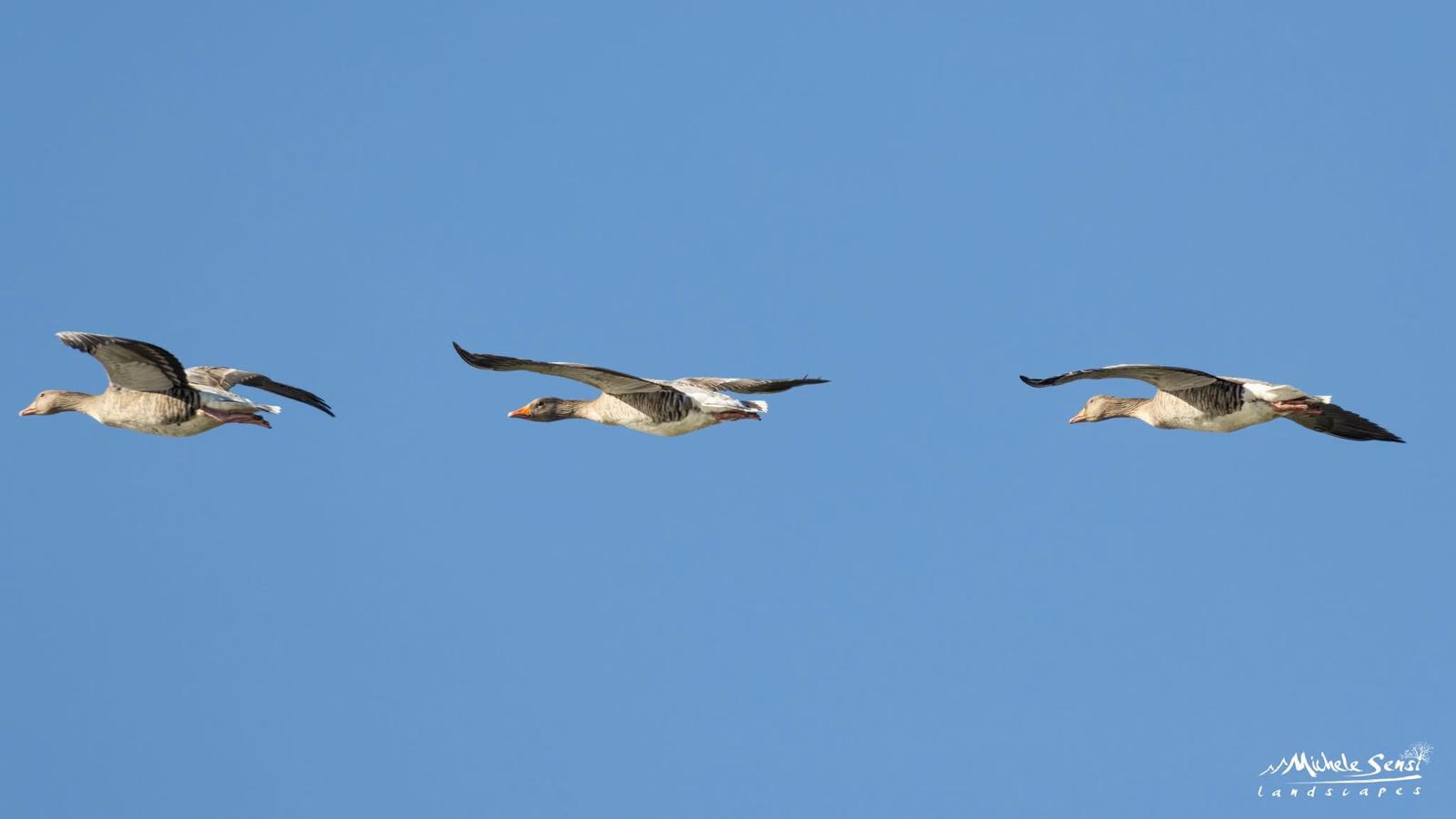 In questo scatto possiamo vedere tre bellissimi esemplari di Oca selvatica o Oca grigia (Anser anser), una specie comune in Europa e che possono essere osservate durante i periodi di migrazione anche nella nostra provincia, specialmente nelle aree vicine ai corsi d'acqua e alle zone umide, che fungono da punti di sosta.