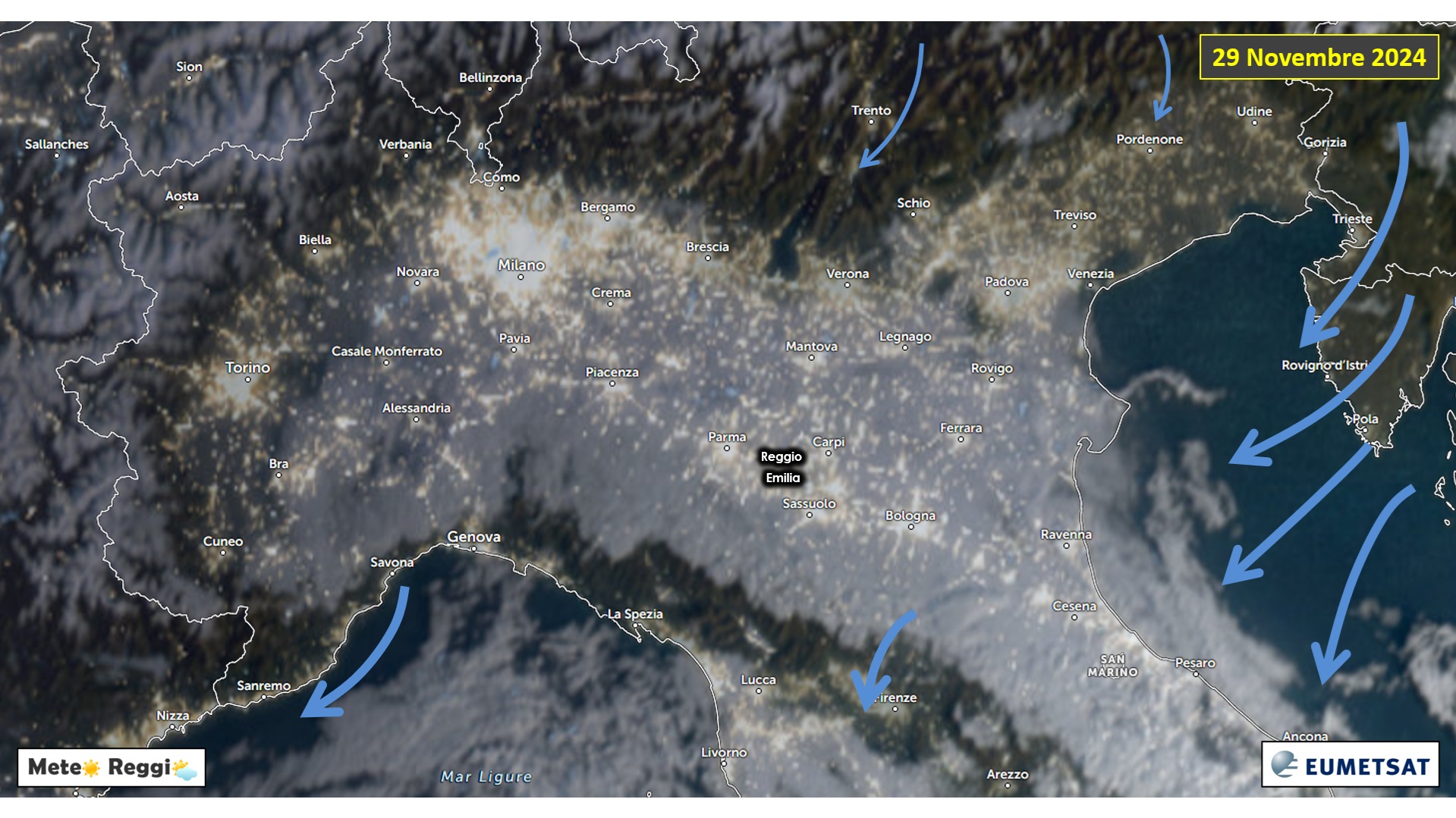 Un getto di aria umida che riempie la Pianura e risalendo l'Appennino si manifesta sempre di più forzato nella risalita. Se ieri parlavamo di Muro del Foehn che bussava dalla Toscana, oggi possiamo dire di essere dalla parte opposta del fronte, oggi abbiamo lo Stau che poi genera il Favonio verso la Toscana.