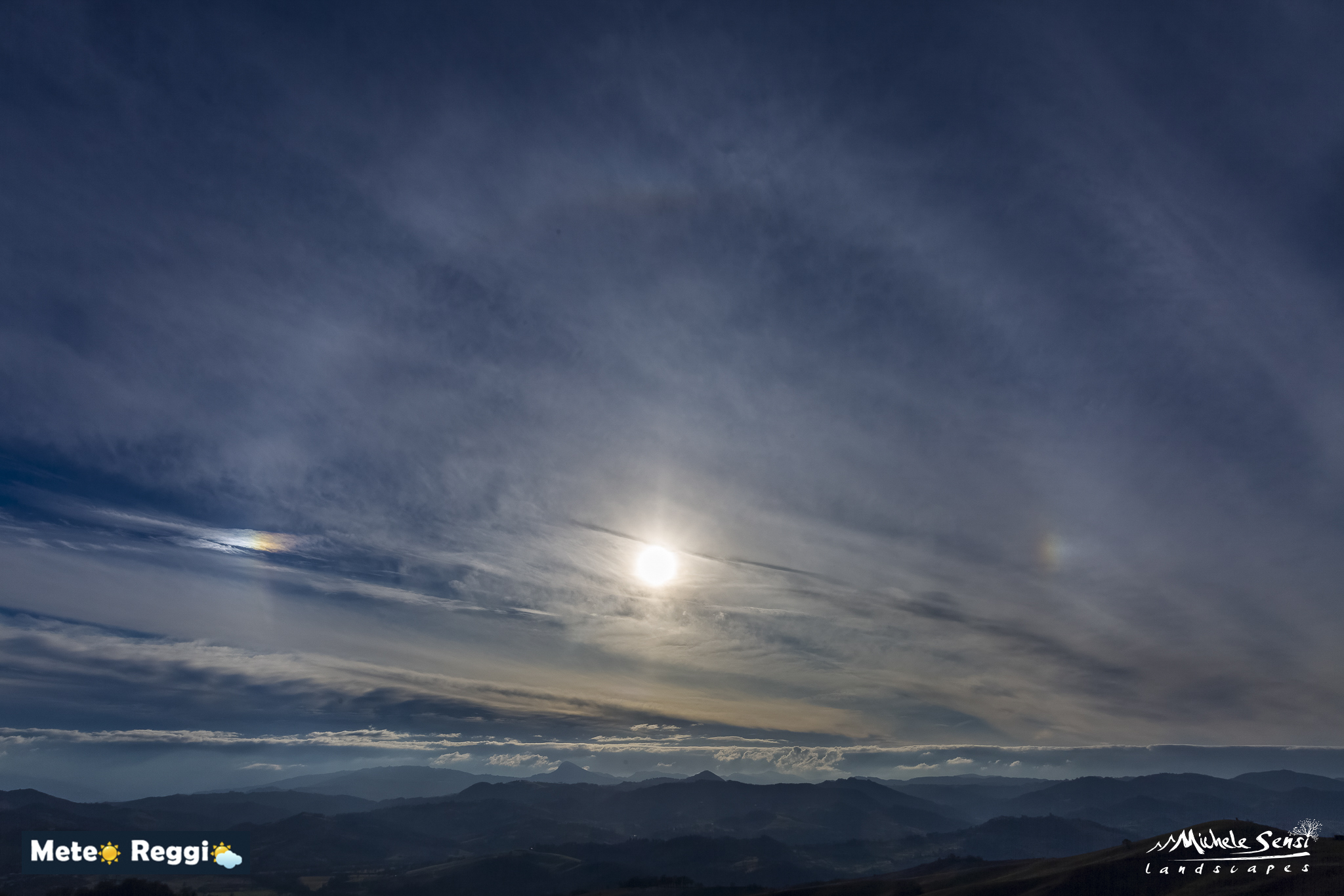 Nell'immagine, oltre all'alone, si possono notare altri fenomeni associati, come i parelii o "cani solari". Questi appaiono come macchie luminose ai lati del Sole e sono il risultato della rifrazione attraverso cristalli di ghiaccio orientati orizzontalmente. I parelii arricchiscono la scena con la loro brillantezza e completano lo spettacolo atmosferico.