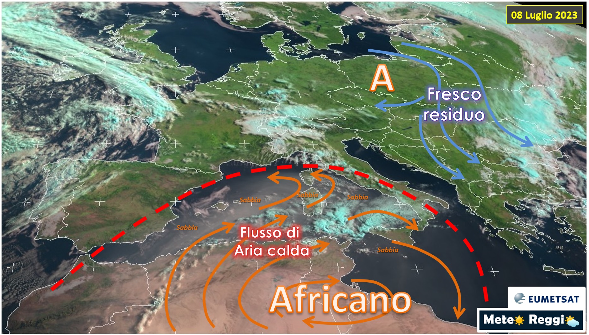 Per ora non possiamo che commentare didatticamente questa immagine che vede l'anticiclone scontrarsi con i flussi di aria più fresca che soffiano sui Balcani, venti che hanno rallentato la marcia dell'Africano, ma che sono destinati ad allontanarsi verso est e lasciare campo alla nuvola ocra di sabbia del deserto che colorerà il nostro cielo e ci regalerà tramonti e albe estremamente "rosse".