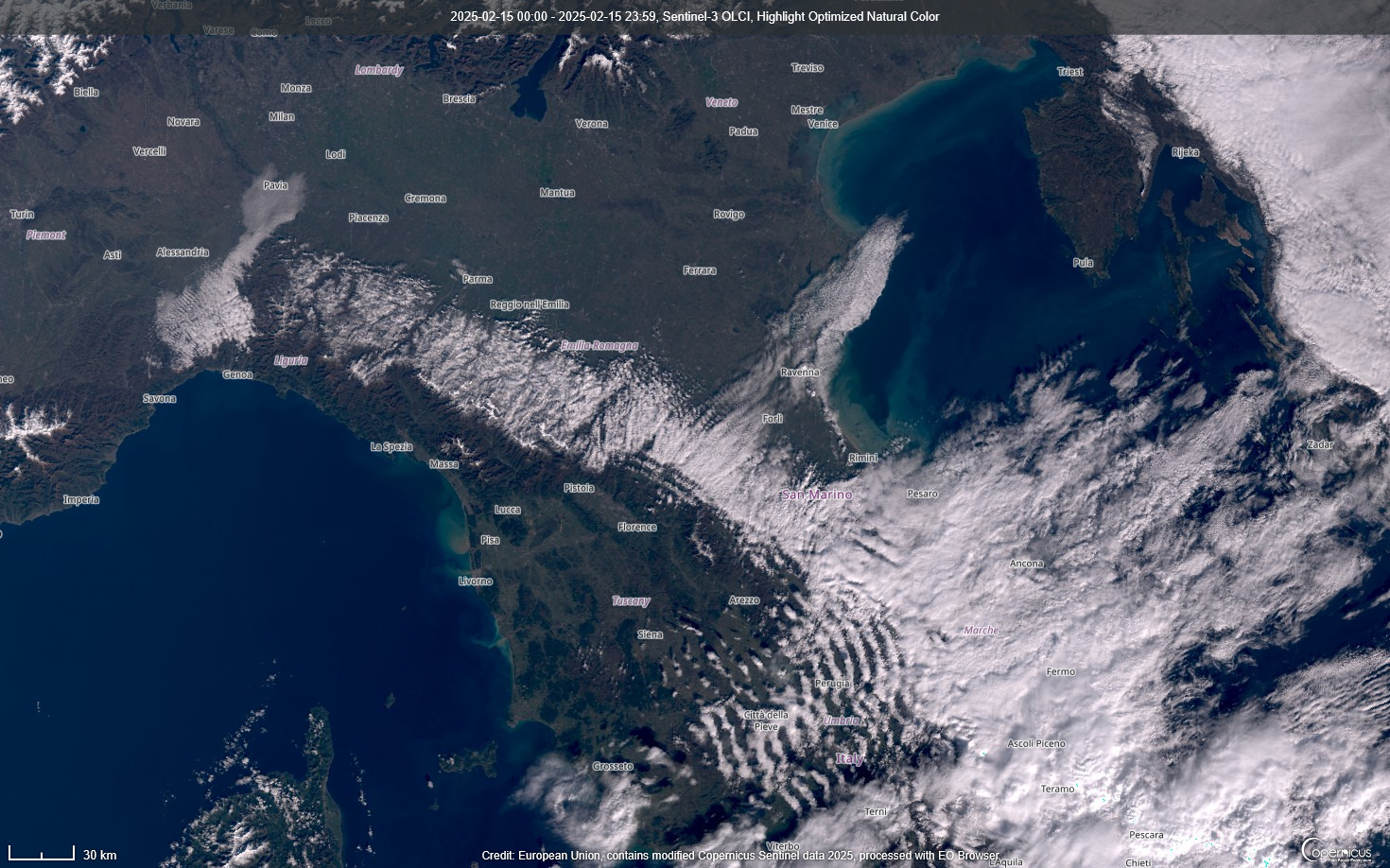 L’immagine satellitare catturata dal satellite Sentinel-3 del programma Copernicus il 15 febbraio 2025 mostra una spettacolare panoramica del Centro-Nord Italia, con una nevicata ben visibile sull’Appennino Emiliano e suggestive formazioni di nuvole orografiche tra Toscana, Umbria e Marche. Questi fenomeni meteorologici sono strettamente legati all’interazione tra le masse d’aria, la conformazione orografica e la circolazione atmosferica a larga scala. In particolare, la nevicata osservata è il risultato di un classico episodio di Stau, mentre le nuvole orografiche evidenziano l’effetto dell’ostacolo imposto dai rilievi al flusso del vento di Bora. ____________________ Lo Stau sull’Appennino Emiliano Il termine Stau indica un fenomeno in cui l’aria, costretta a sollevarsi a causa di una catena montuosa, subisce un raffreddamento adiabatico, con conseguente condensazione dell’umidità e formazione di nubi e precipitazioni abbondanti. Nel caso specifico, la nevicata sull’Appennino Emiliano è stata innescata dall’arrivo di aria fredda e umida da nord-est, associata a un’intensa circolazione di Bora. Quando questa massa d’aria ha incontrato i rilievi dell’Appennino, è stata obbligata a sollevarsi, raffreddandosi rapidamente e favorendo la formazione di nubi da Stau che hanno scaricato neve abbondante sulle province di Parma, Reggio Emilia, Modena e Bologna. Questo tipo di precipitazioni è molto comune quando si verificano afflussi freddi dall'est, che trovano un’ottima "barriera" nei monti dell’Appennino settentrionale, determinando accumuli significativi di neve, spesso superiori ai 50 cm nelle località più elevate. Il Vento di Bora e le Nuvole Orografiche su Toscana, Umbria e Marche Spostando lo sguardo verso il centro della penisola, l’immagine mostra una serie di nubi disposte secondo un pattern ben preciso sulle regioni Toscana, Umbria e Marche. Queste formazioni sono dovute all’interazione tra il flusso del vento di Bora e il profilo orografico dell’Appennino Centrale. La Bora, un vento freddo e secco che soffia dai quadranti nord-orientali, è tipica delle irruzioni artiche continentali che interessano l’Italia. Quando questa corrente d’aria incontra gli Appennini, il flusso viene disturbato, dando origine a onde atmosferiche che producono alternanze di nubi e cielo sereno, come si nota chiaramente nell’immagine. Si tratta di un fenomeno simile alle nubi lenticolari, ma su scala più ampia: la Bora, nel suo movimento turbolento sopra i rilievi, genera un'onda di sollevamento e condensazione, seguita da una fase di discesa e disseccamento, creando l’alternanza di bande nuvolose. Questo schema è ben visibile tra la Val Tiberina, il Monte Subasio e il massiccio del Gran Sasso. Un altro elemento interessante dell’immagine è la netta distinzione tra i due versanti dell’Appennino: Sul lato sopravento (est, verso l’Adriatico) si accumulano nubi da Stau e precipitazioni, con cieli coperti e nevicate o piogge abbondanti. Sul lato sottovento (ovest, verso la Toscana e l’Umbria) l’aria, una volta superata la catena montuosa, subisce un riscaldamento adiabatico e una progressiva evaporazione delle nubi, generando cieli più sereni. Questo è un tipico effetto Föhn, ovvero un vento di caduta caldo e secco che si manifesta sul versante opposto rispetto a dove si è verificato lo Stau.