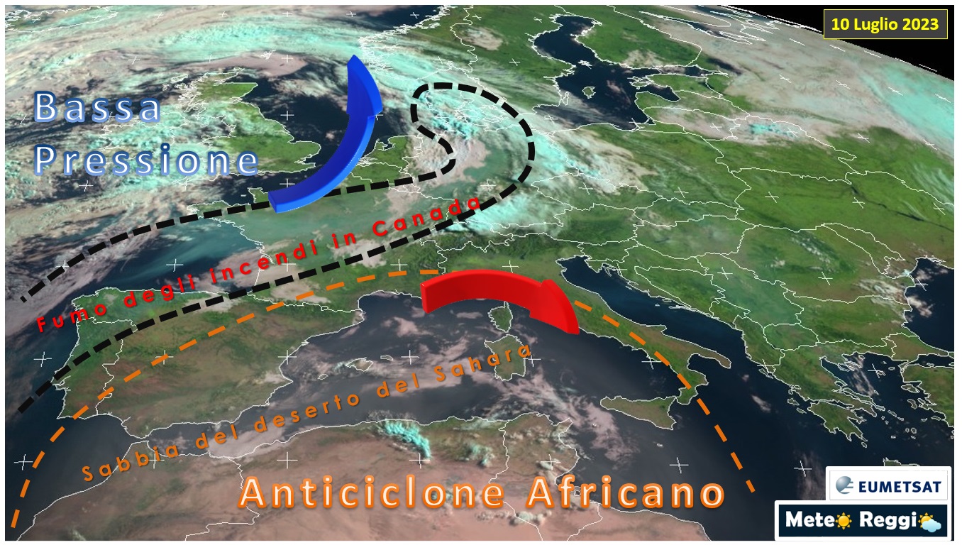 Intanto vediamo come da ovest sia arrivata una potente "spallata" atlantica che ha allontanato il caldo estremo dalla Francia verso la Germania. Ma non solo... questa spallata è arricchita da polveri sottili che arrivano da oltre oceano. Si tratta di cenere dei devastanti incendi che ormai non danno respiro al Canada, fumi che hanno iniziato il loro viaggio tra il 3 e il 4 luglio e che dopo aver stazionato un po' sulla punta sud della Groenlandia hanno agganciato le correnti giuste per arrivare fino in Europa. La cenere è ben visibile sotto forma di tenue striscia grigiastra, di un colore chiaramente diverso dalle normali nuvole di vapore acqueo.