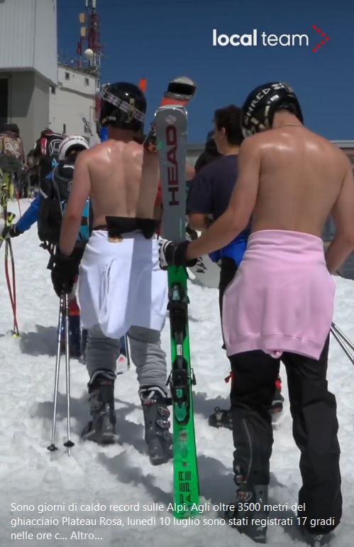 Questo spaventoso dato ci fa ben capire che la situazione in Montagna è preoccupante e la fusione di ghiacciai procede a velocità altissime, come testimoniato dall'immagine della pagina "Local-Team" che mostra gli sciatori sul ghiacciaio del Plateau Rosa a dorso nudo. Un pomeriggio da +17°C, chissà mercoledì 19 di quali tristissimi record parleremo?