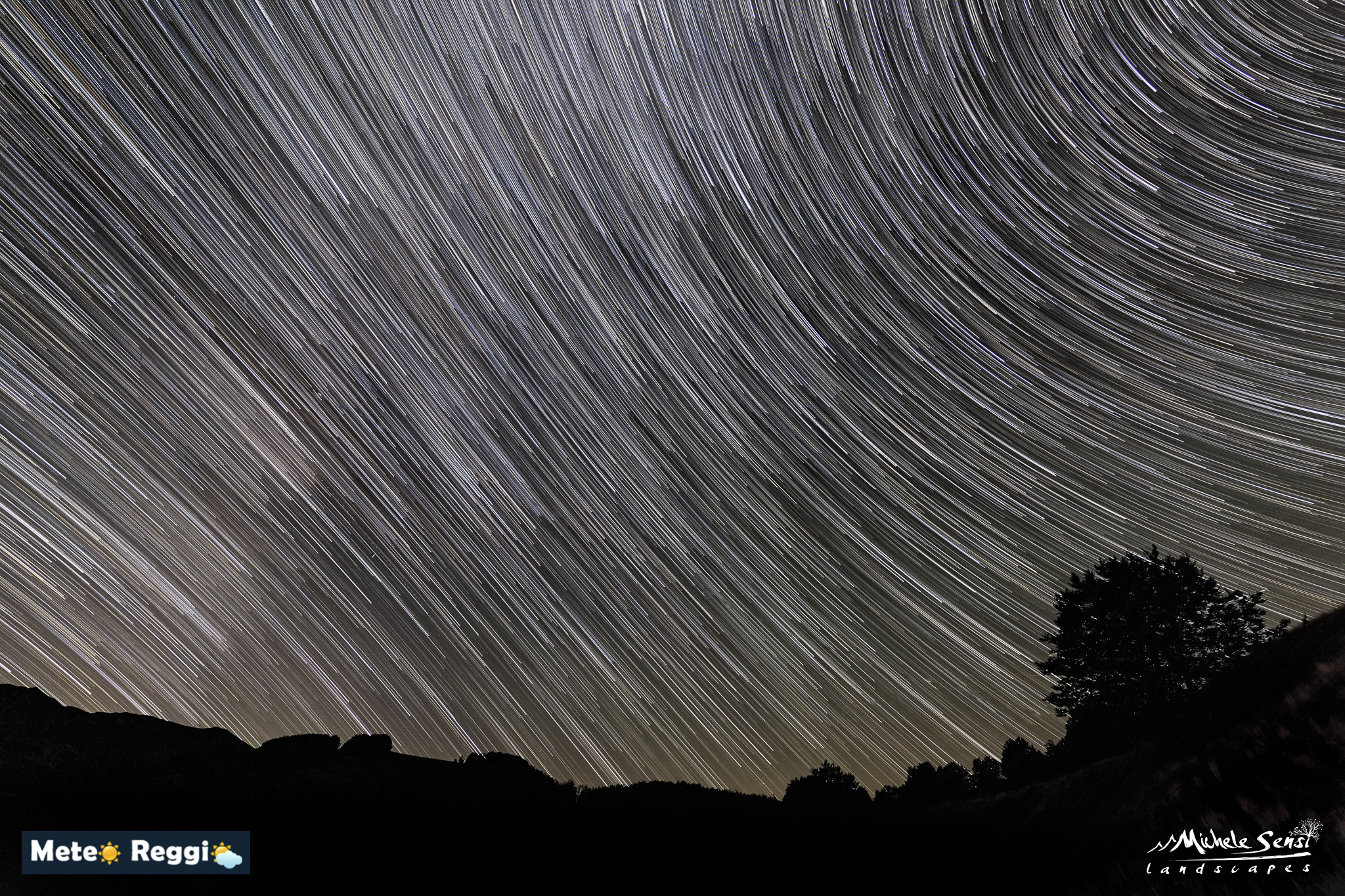 Quella che state osservando è una straordinaria immagine del cielo notturno a Succiso realizzata da Michele con una tecnica chiamata startrail, che mostra il movimento apparente delle stelle nel corso di diverse ore. Ma non si tratta di un effetto speciale: è il risultato di una lunga esposizione fotografica o della somma di molte foto scattate a intervalli regolari durante la notte.