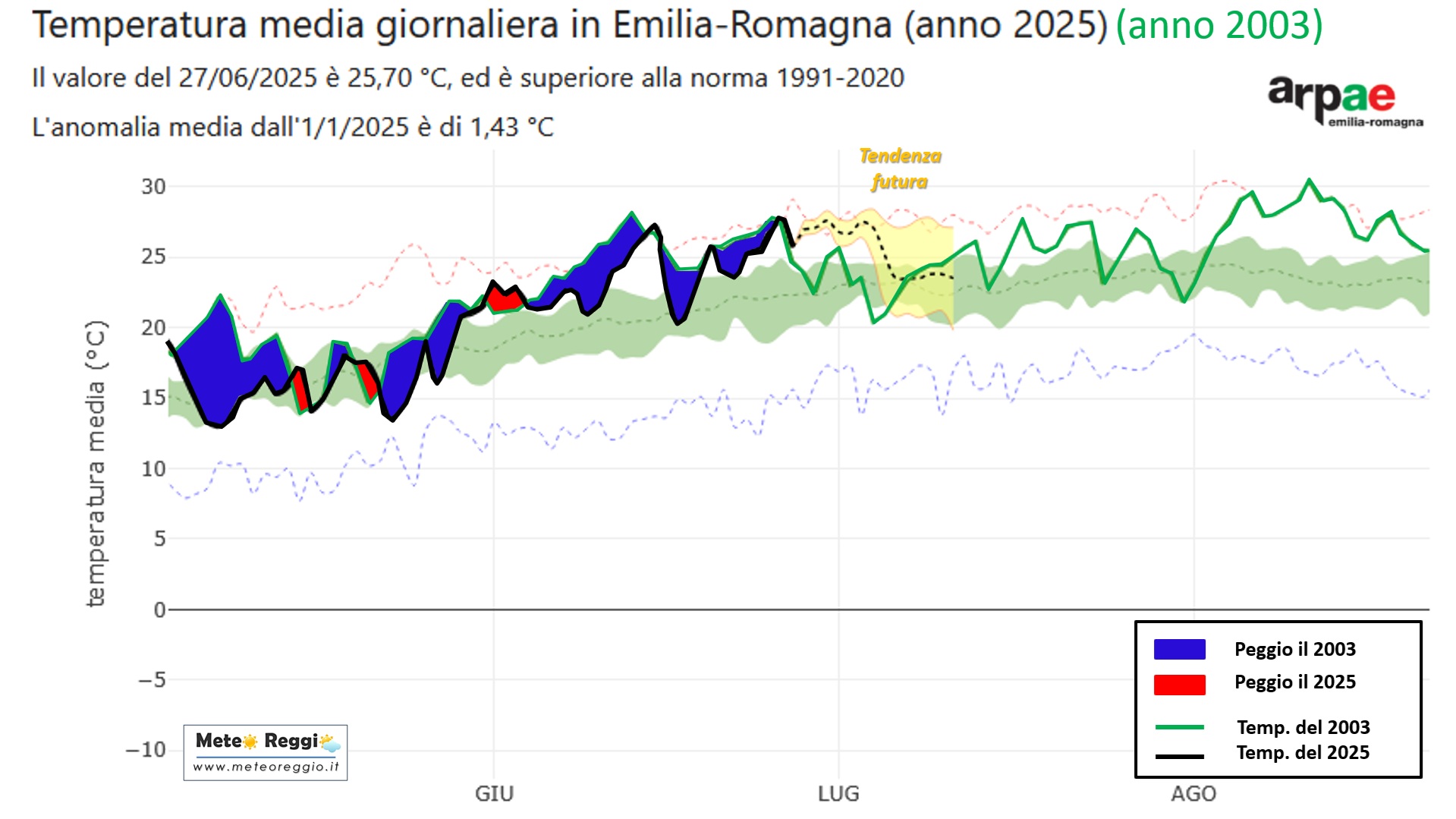 Finora la situazione sembra chiara: il 2003 ha dominato gran parte del periodo, soprattutto a maggio e nella prima metà di giugno. Tuttavia, tra il 15 e il 26 giugno 2025, due giornate sono risultate le più calde mai registrate dal 1960 in Emilia-Romagna, con picchi di temperatura media giornaliera tra i più elevati dell’intera serie storica.