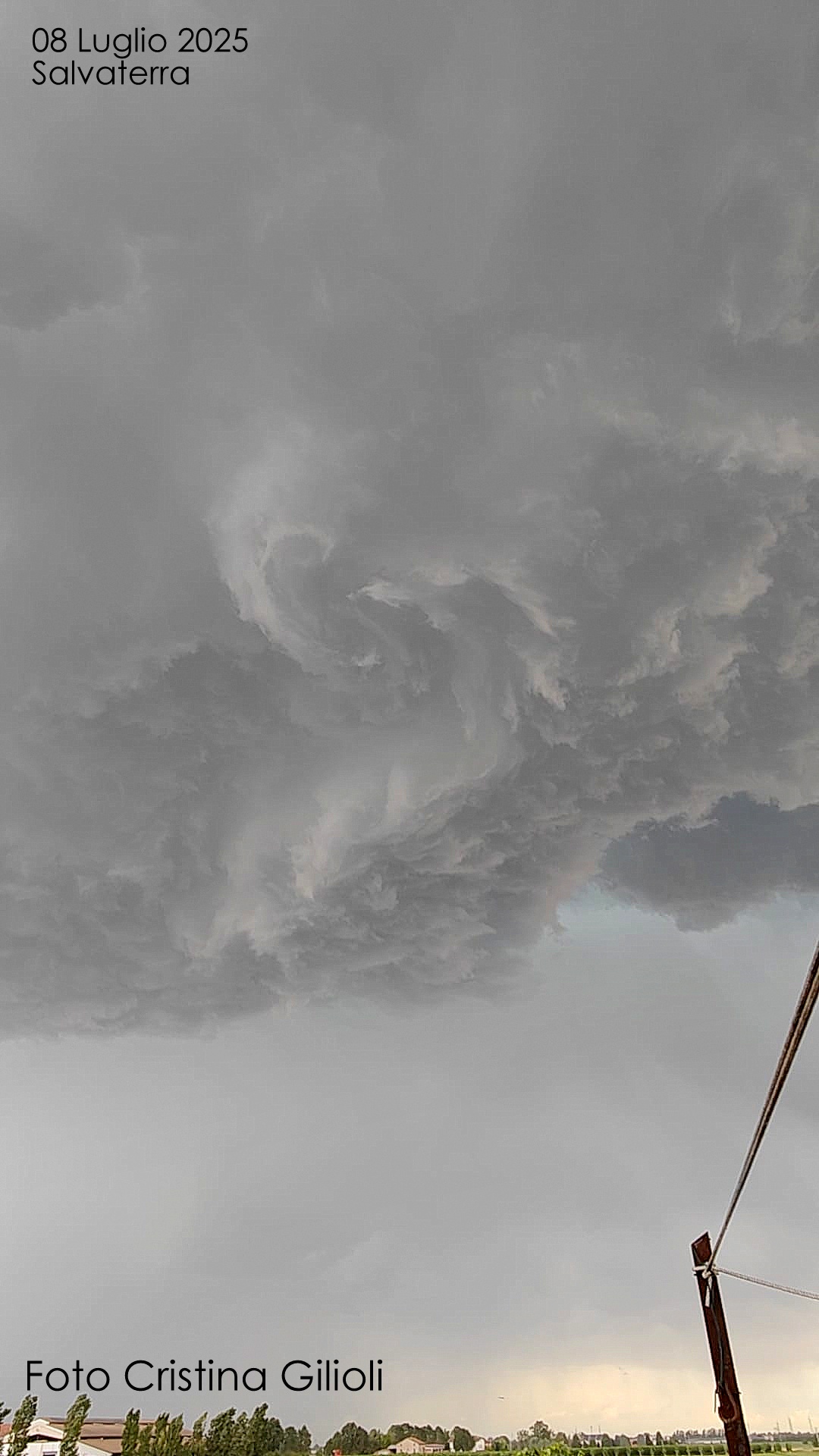 L’aria che scende impatta violentemente sul suolo e si disperde lateralmente in tutte le direzioni, formando un fronte di raffiche che precede il temporale. In questo caso, il vento in caduta ha raggiunto le zone di Casalgrande, Rubiera e dintorni, sollevando polvere e detriti ben visibili nella parte inferiore dell’immagine.