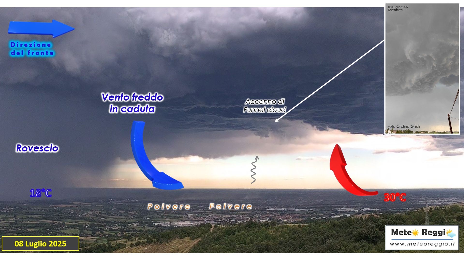 Nel pomeriggio di martedì 8 luglio 2025, la nostra webcam posizionata sul Monte Evangelo, alle spalle di Scandiano, ha catturato uno spettacolare momento dell’avvicinamento del temporale intenso che ha colpito la città di Reggio Emilia. L’immagine è molto interessante dal punto di vista meteorologico, poiché mostra in modo didattico la dinamica dell’interazione tra l’aria calda preesistente e la colata di aria fredda generata dal temporale stesso.