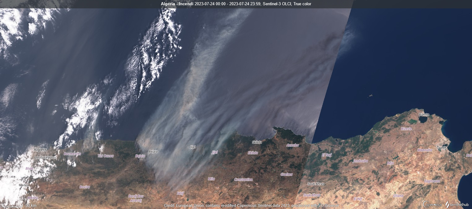 Oggi però lo scenario viene catturato dalla gigantesca nuvola di fumo che si staglia nel mar Mediterraneo dalle coste dell'Algeria. Fumi che inevitabilmente viaggeranno verso la nostra Penisola nei prossimi giorni. Si parla di più di 97 focolai spuntati in pochissimo tempo per via di incendi boschivi che si propagano sotto la spinta del forte vento che soffia dal deserto verso il mare sotto la spinta dell'Anticiclone Africano. Purtroppo si contano già 15 morti e decine di feriti tra chi cerca di sfuggire al fumo e le fiamme sulla spiaggia di Bejaia. Altri focolai arrivano da Bouira fino a Jijel.
