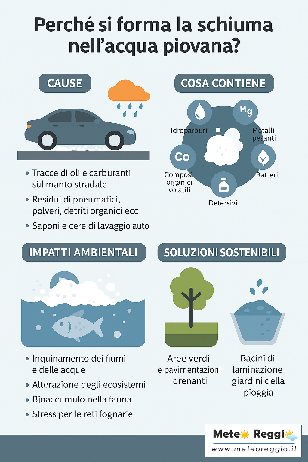 Quando arriva un temporale, la pioggia scioglie e trascina via questi materiali. Alcuni di essi contengono tensioattivi (come quelli presenti nei saponi), che possono generare schiuma quando l'acqua si mescola all'aria, specialmente dopo il passaggio delle auto che agitano il liquido. Questo spiega perché la schiuma appare soprattutto dopo il passaggio dei veicoli.