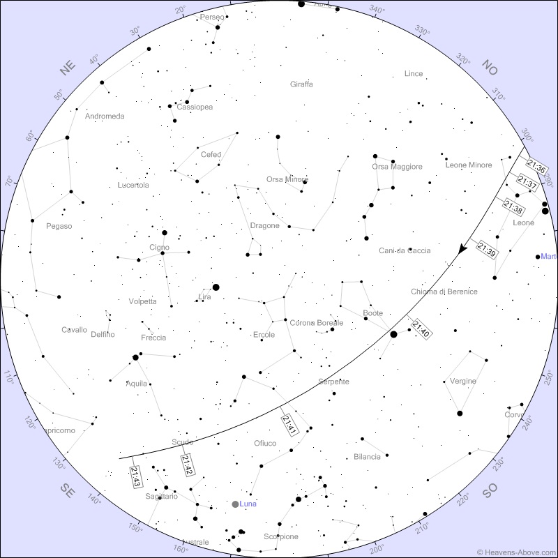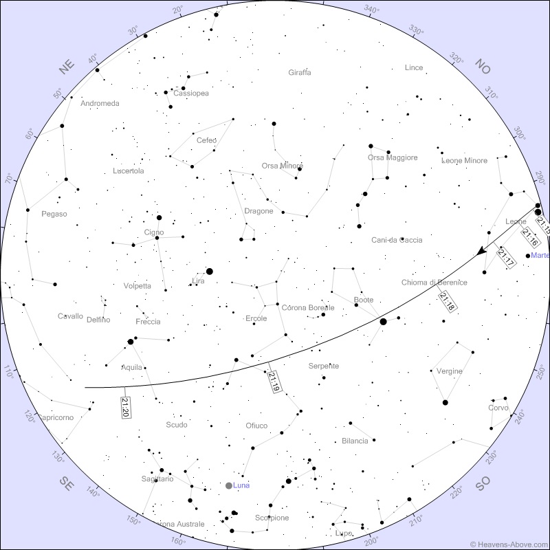 Tuttavia il traffico sulla nostra testa è intenso e questa sera occhio al cielo in prima serata perchè si partirà alle 21:16 con un luminoso passaggio del nuovo trenino "Starlink" lanciato da poco da Space-X. Per tale ragione ci sono buone probabilità di vederli ancora tutti vicini tra loro e luminosi per la scarsa altezza. Occhi puntati verso la stella di Arturo alle 21:18 abbastanza alta in cielo.