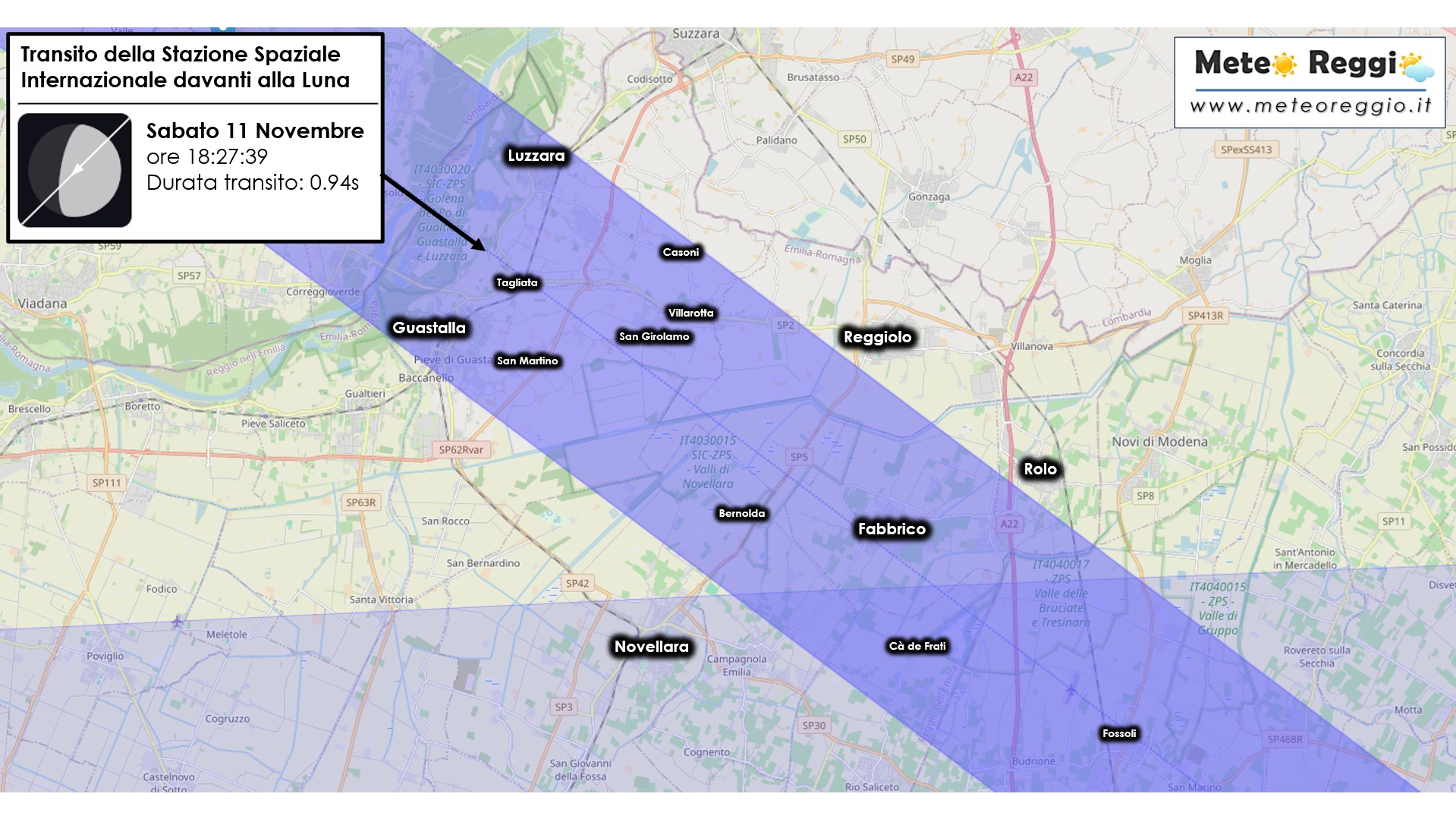 L'osservazione sarà possibile solo da una strettissima porzione di territorio, un corridoio di pochi chilometri che si estende nell'area tra Guastalla, Luzzara e Fabbrico. È in questa "linea di centralità" che la sagoma scura della ISS sfreccerà contro lo sfondo lunare per una durata incredibilmente breve: nel punto più favorevole, l'evento durerà appena 1 solo secondo.