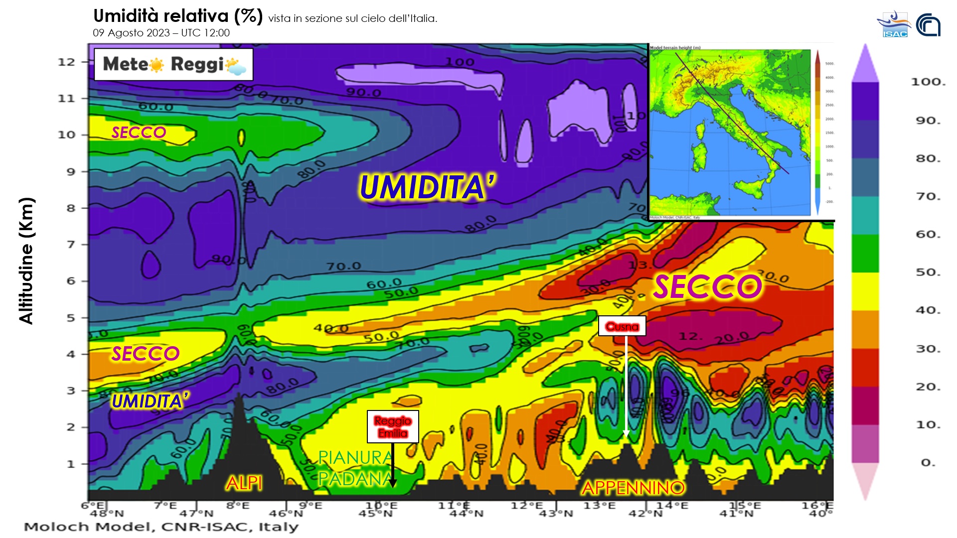 In questa immagine vediamo una "sezione" della colonna d'aria presente sulla nostra testa. I colori più freddi tendenti al blu/viola ci mostrano alte concentrazioni di umidità nell'aria. I colori più caldi ci mostrano, al contrario, le zone più secche e povere di componente acquosa nell'aria.