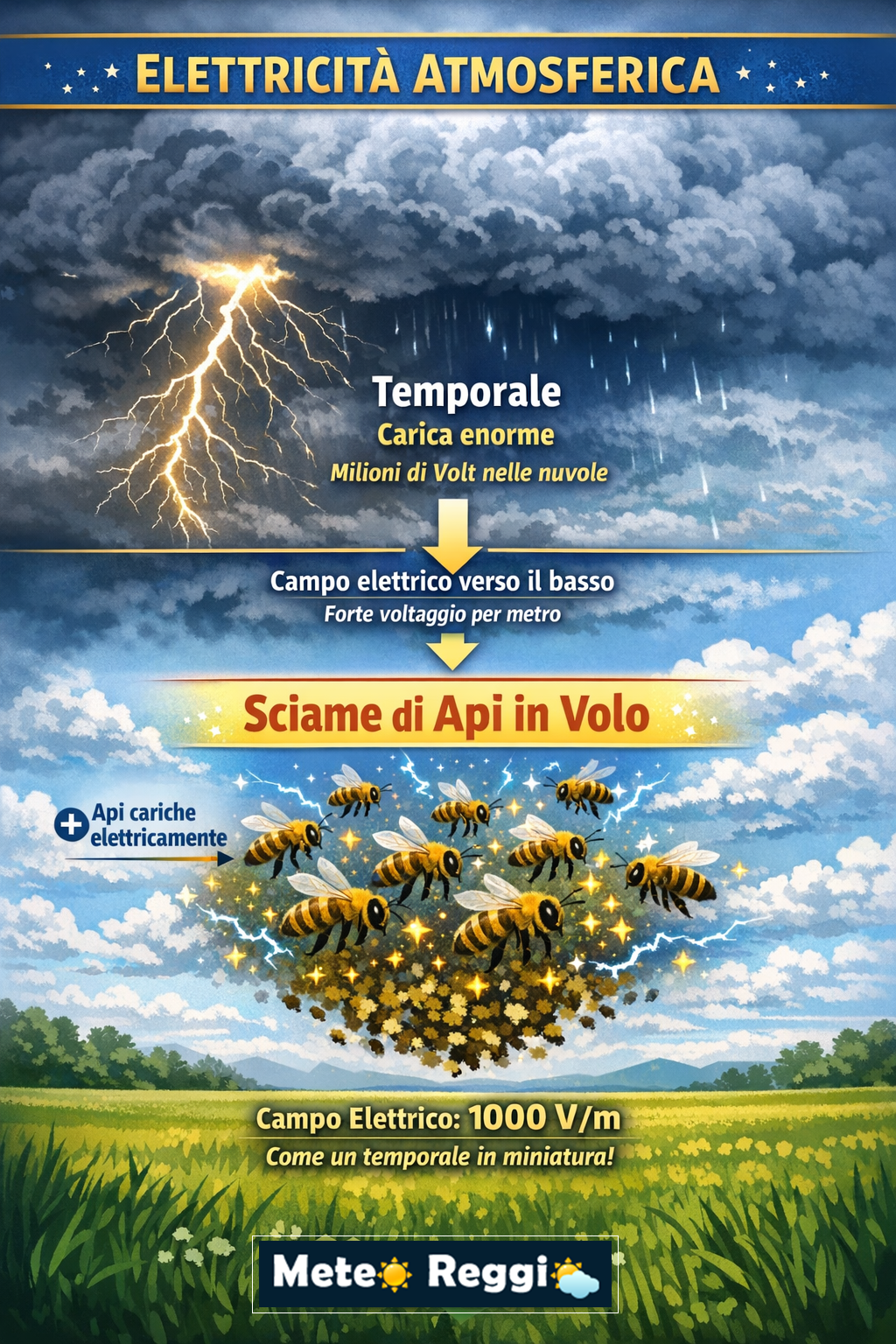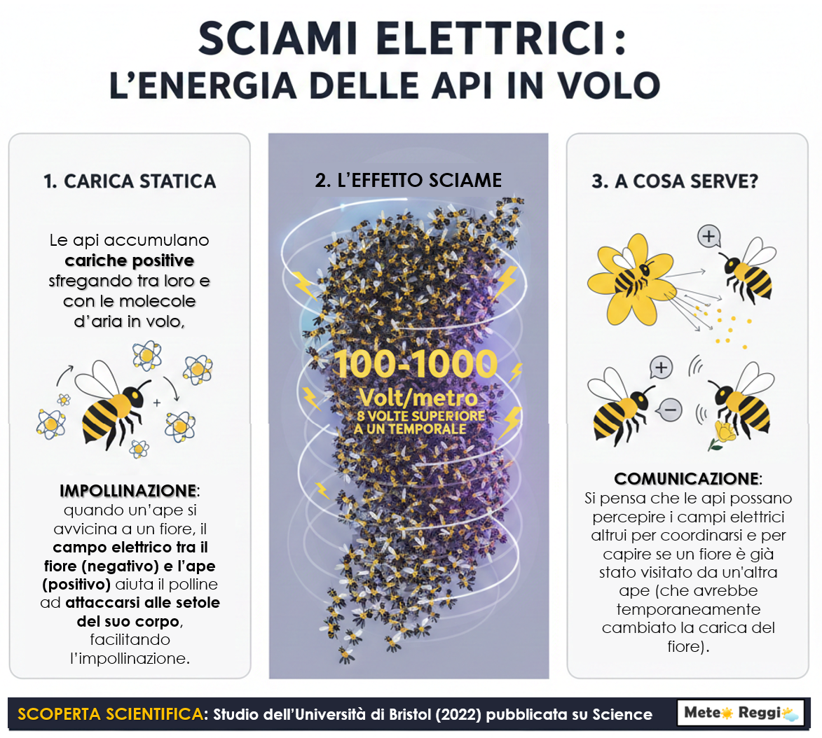 Fino a poco tempo fa, si pensava che solo i processi fisici (come il movimento del ghiaccio nelle nuvole o della polvere nel vento) potessero influenzare l'elettricità atmosferica. Questa ricerca dimostra che la biologia ha un ruolo attivo: enormi sciami di insetti (non solo api, ma anche cavallette o locuste) possono effettivamente modificare il campo elettrico dell'ambiente circostante, influenzando potenzialmente il movimento di polveri e aerosol nell'aria.