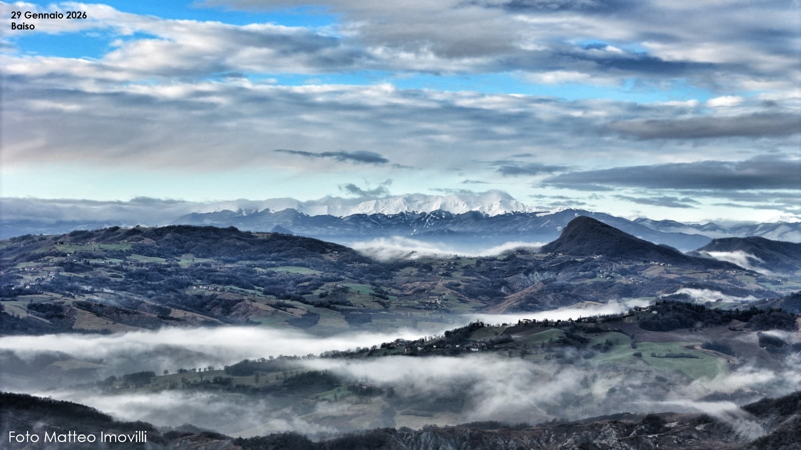 Questa immagine di Matteo Imovilli è un manuale di meteorologia e geografia appenninica in un solo scatto. Siamo a Baiso, nel cuore del medio Appennino reggiano, in una mattina che respira ancora l’umidità della pioggia appena caduta.