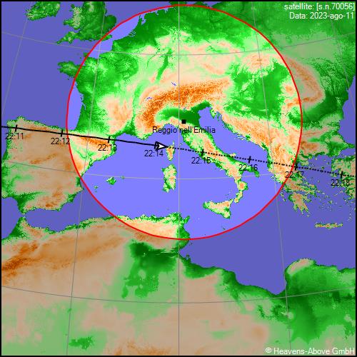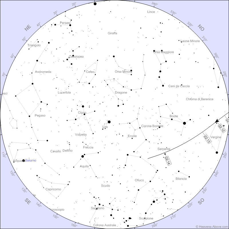 I satelliti passeranno nel mezzo tra le due stelle alle 22:13 per salire e spegnersi poco dopo le 22:14 in prossimità della costellazione di Ofiuco (13^ costellazione dello zodiaco).