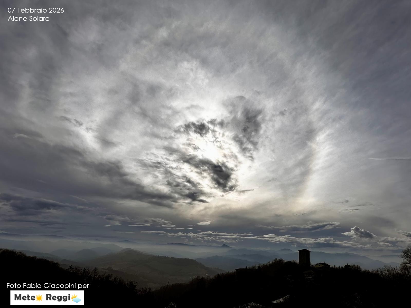 Giornata di grandi velatue verso sud e questa splendida immagine catturata da Fabio Giacopini ci mostra uno dei fenomeni ottici più affascinanti dell'atmosfera: un Alone Solare di 22°.