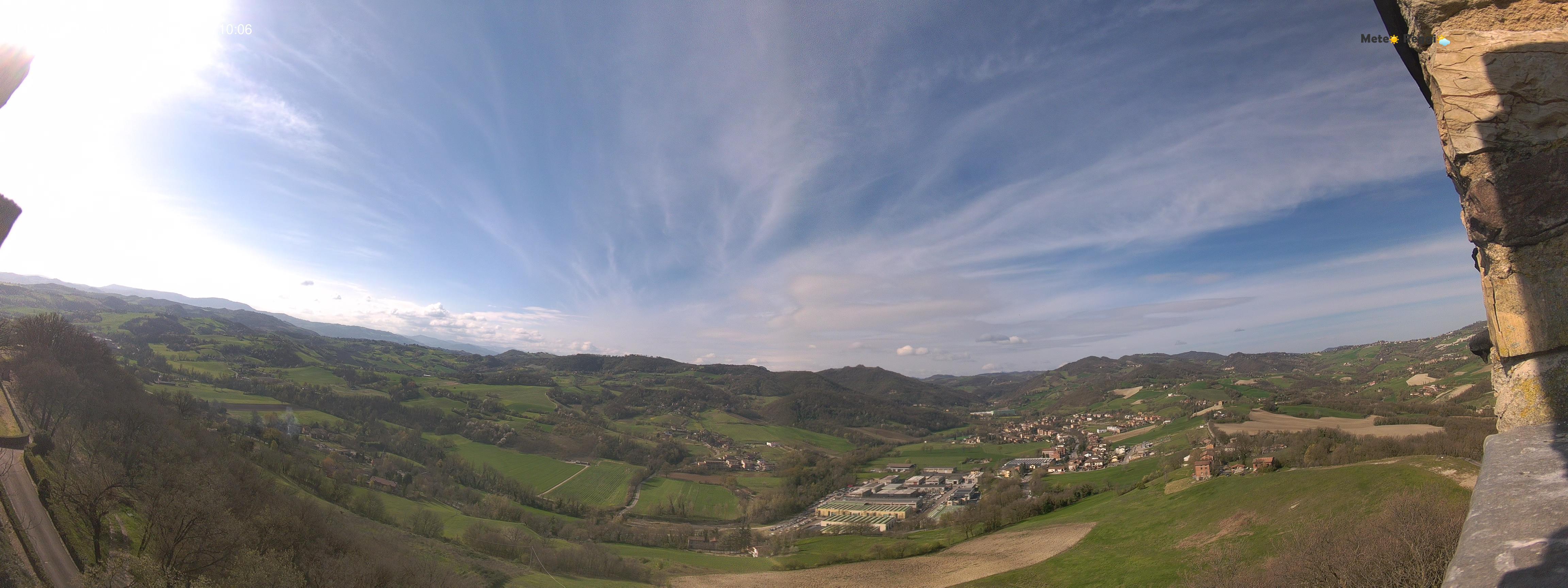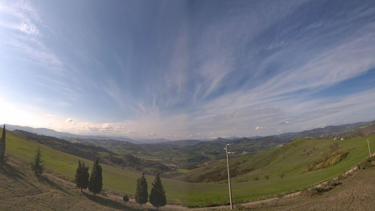 Queste eleganti formazioni nuvolose che state osservando dalla webcam del Castello di Viano e dal Monte Evangelo sono chiamate Cirri (nello specifico, data la loro forma allungata e stirata, si possono classificare come Cirrus fibratus o Cirrus radiatus).