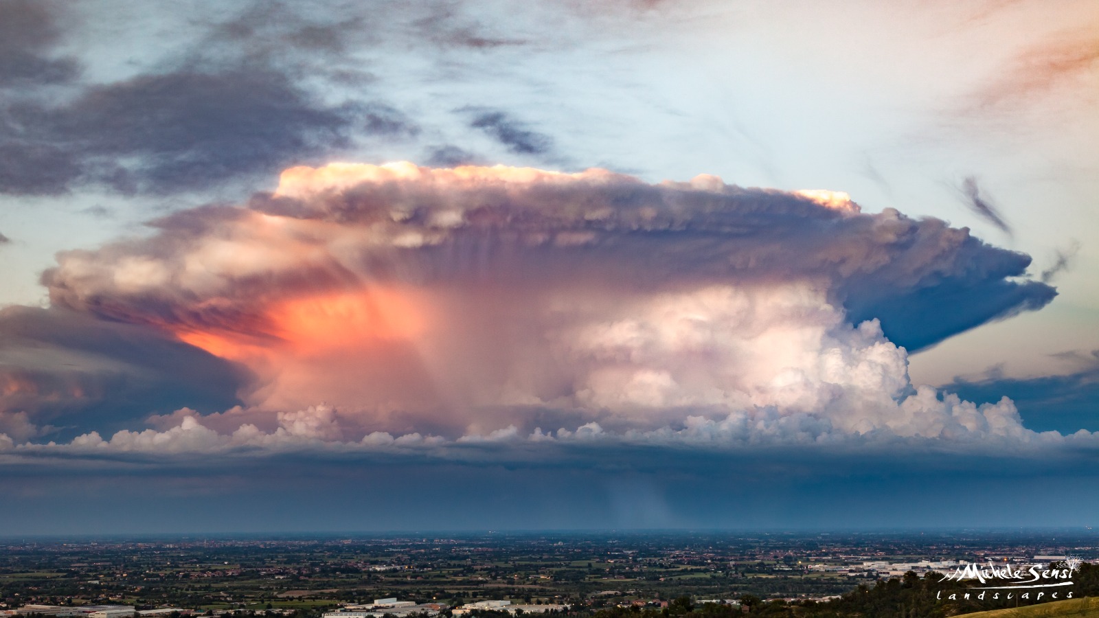 In questo immagine del nostro instancabile Michele Sensi vediamo uno splendido esempio di "Tropopausa" applicata ad un Cumulonembo. Vediamo il momento in cui un camino di vapore che sale dalla Pianura raggiunge il limite della Troposfera.