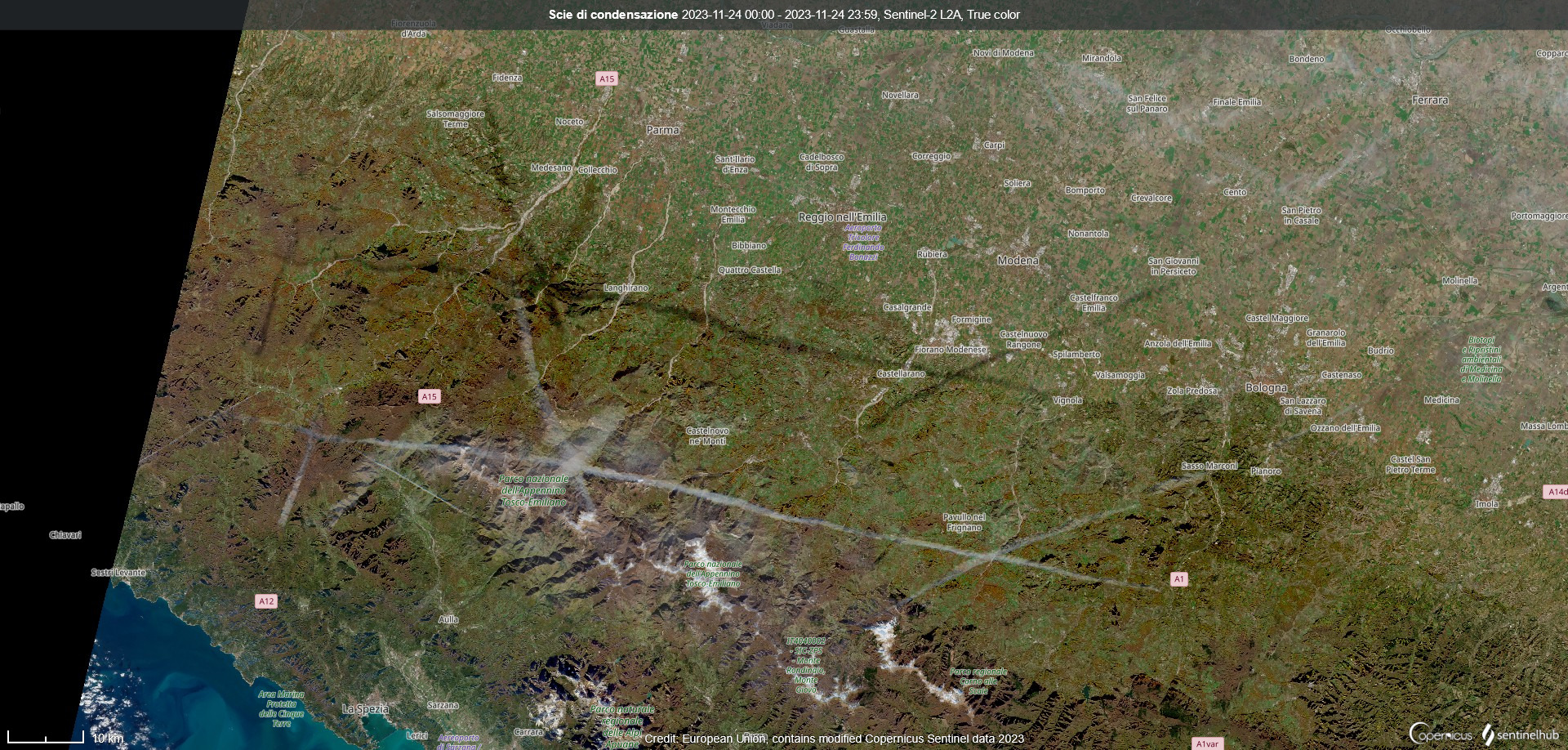 Graffi nel cielo che però possono dirci tanto sulla giornata. Non solo intermini di umidità, ma anche di orario ... secondo voi a che ora è passato il satellite Sentinel-2? (indicativamente).