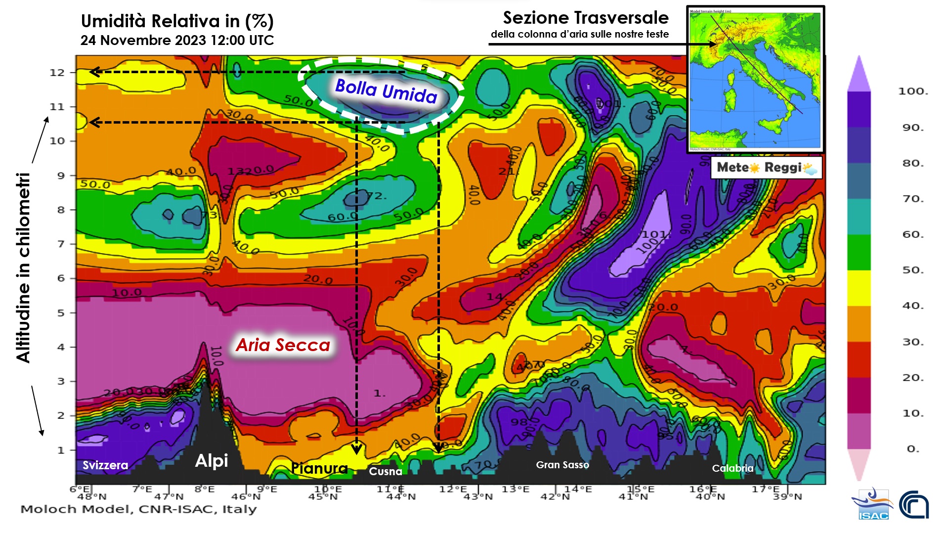 L'immagine con il grafico tutto colorato ci mostra la sezione di aria presente sull'Italia. Un po' come se avessimo "affettato" una striscia d'aria che va dalla Svizzera alla Calabria osservandola di lato. In questo modo è facile leggere dov'era l'aria secca e dov'era l'aria umida. Sul fondo abbiamo il profilo del suolo con Alpi, Pianura e Appennino fino alla Sila.