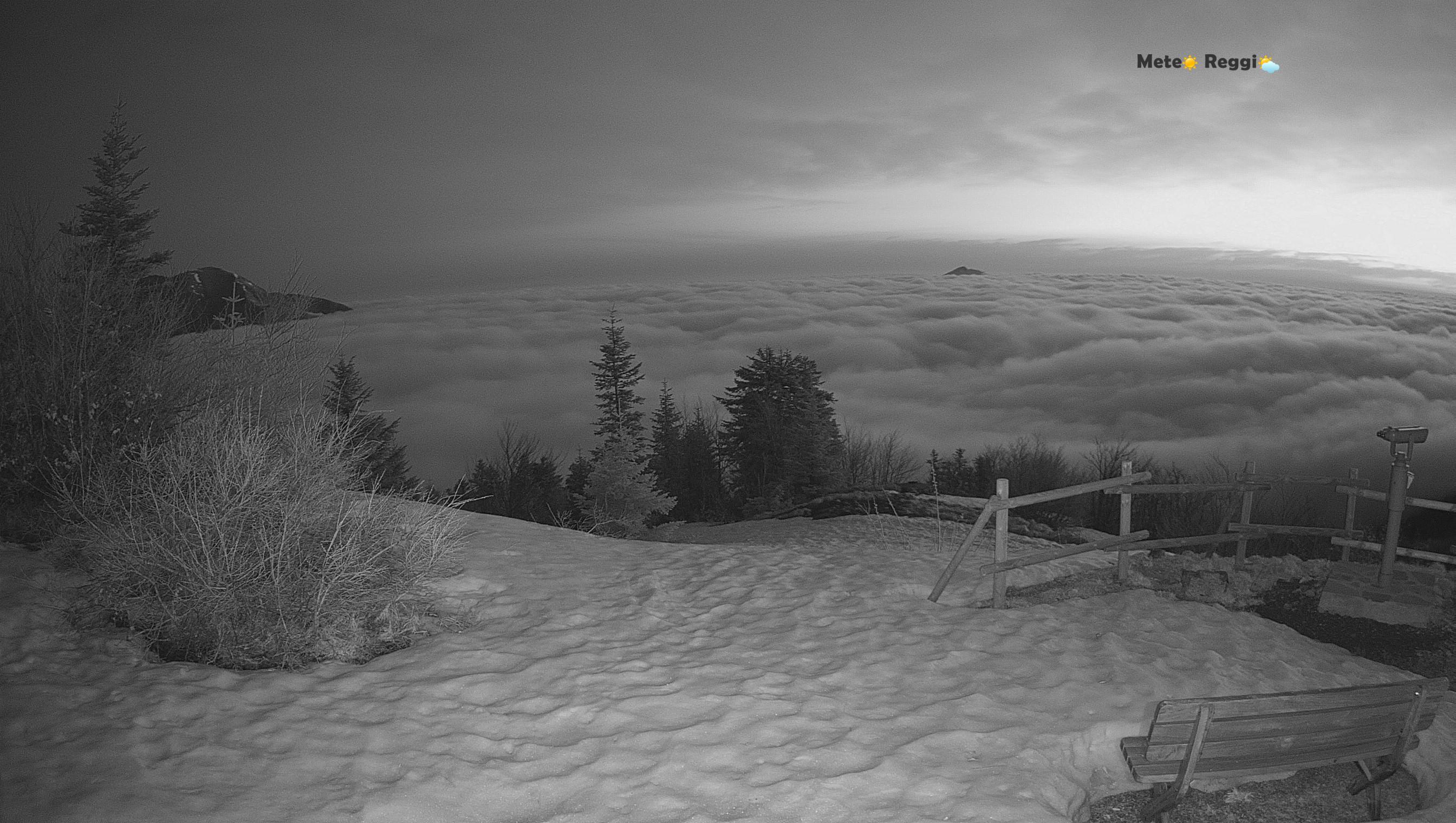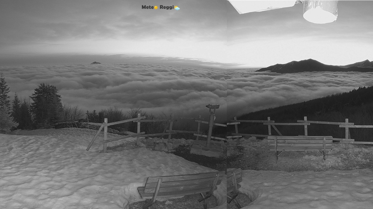 L'inquadratura panoramica ci mostra le panchine ancora circondate dalla neve, testimoni silenziose di un inverno che a 1.700 metri non molla la presa. Pochi minuti prima e pochi minuti dopo questo scatto, la nebbia ha "mangiato" anche questa postazione: un promemoria di quanto sia sottile e dinamico il confine tra il sole e il grigio quando ci si trova alla quota di galleggiamento delle nubi.