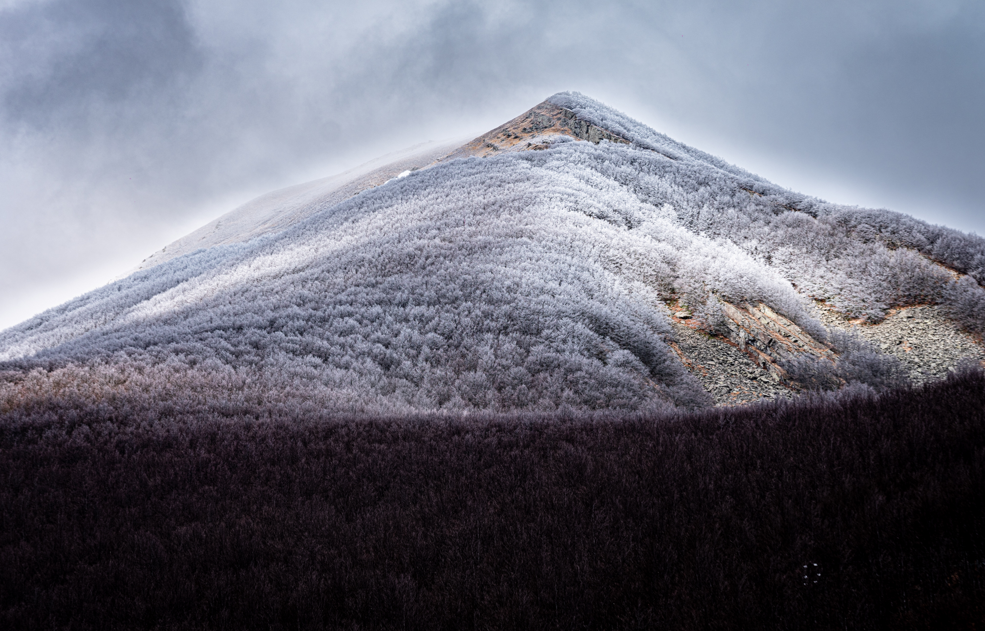 In questa immagine possiamo apprezzare le fitte faggete che ricoprono i fianchi del monte ricoperti da un sottile strato di neve e i "ghiaioni" frutto dell'erosione delle unità toscane a Macigno depositatesi tra i 20 e i 30 milioni di anni fa circa.