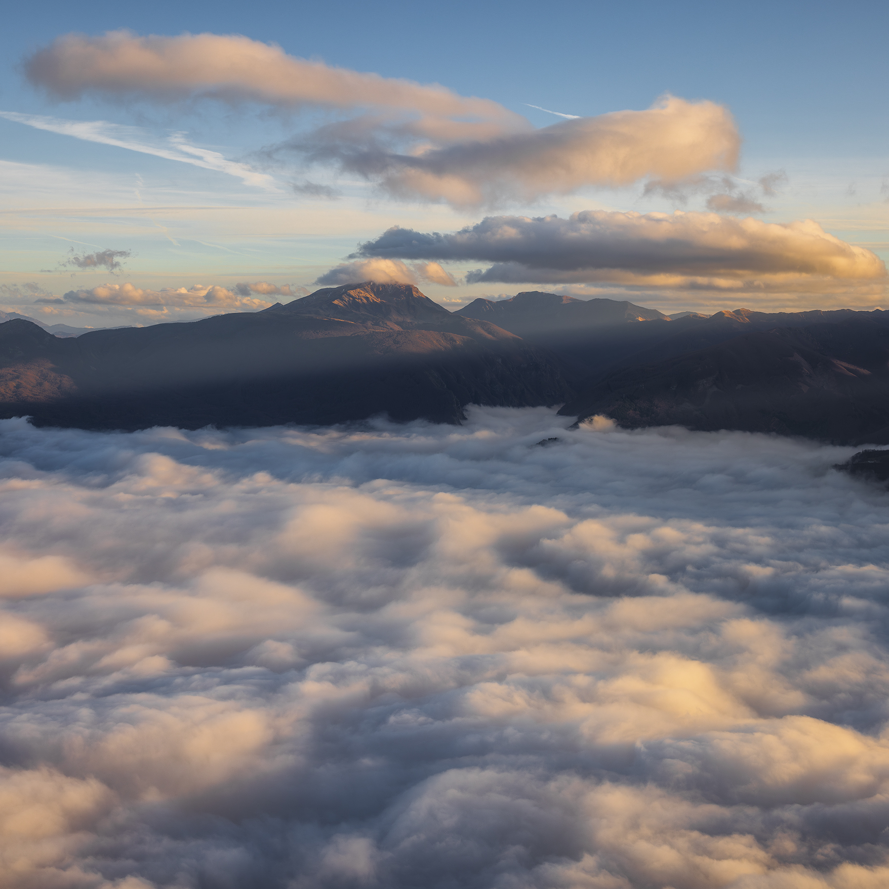 -> Nuvole stratificate basse (strati o stratus): nella parte inferiore della foto, si nota uno spesso strato di nuvole compatte che coprono le valli. Queste sono nuvole di tipo stratus, formate per raffreddamento dell’aria umida intrappolata nelle valli, una condizione favorita dalla morfologia dell'Appennino. Possono anche essere associate a inversioni termiche, tipiche di zone montane durante l’autunno e l’inverno.