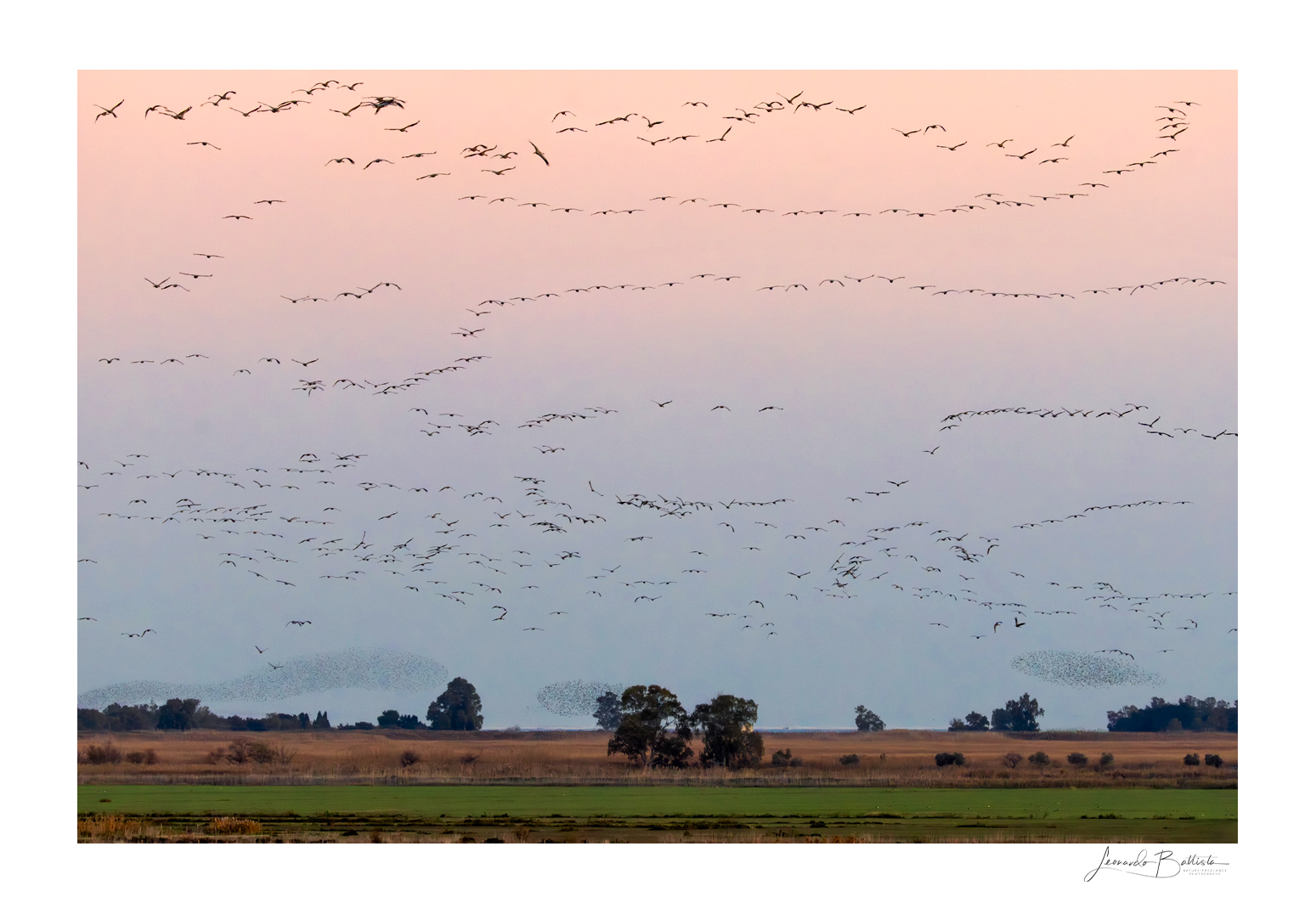 Anche gli storni (Sturnus vulgaris) sono migratori in Pianura Padana, ma con dinamiche diverse rispetto alle gru. In Italia si possono osservare due tipi di popolazioni: