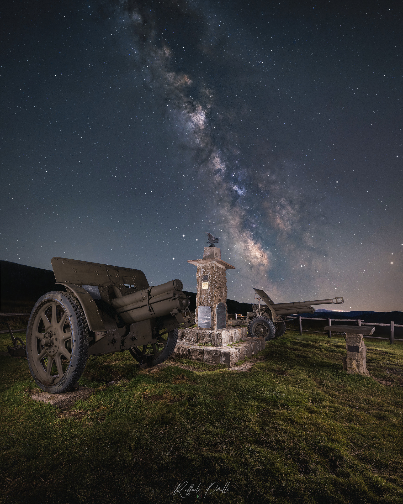 Ci portiamo nei pressi del suggestivo memoriale alle vittime della seconda guerra mondiale posto nel Passo di Croce Arcana per parlarvi della storia di questo meraviglioso luogo carico di storia, spiritualità e bellezza naturale. La foto ci mostra un momento mozzafiato: la Via Lattea che si apre sopra il monumento ai Caduti della Seconda Guerra Mondiale, vegliato da due cannoni storici. Un contrasto potente tra la memoria di una guerra e l’infinita pace del cielo notturno.