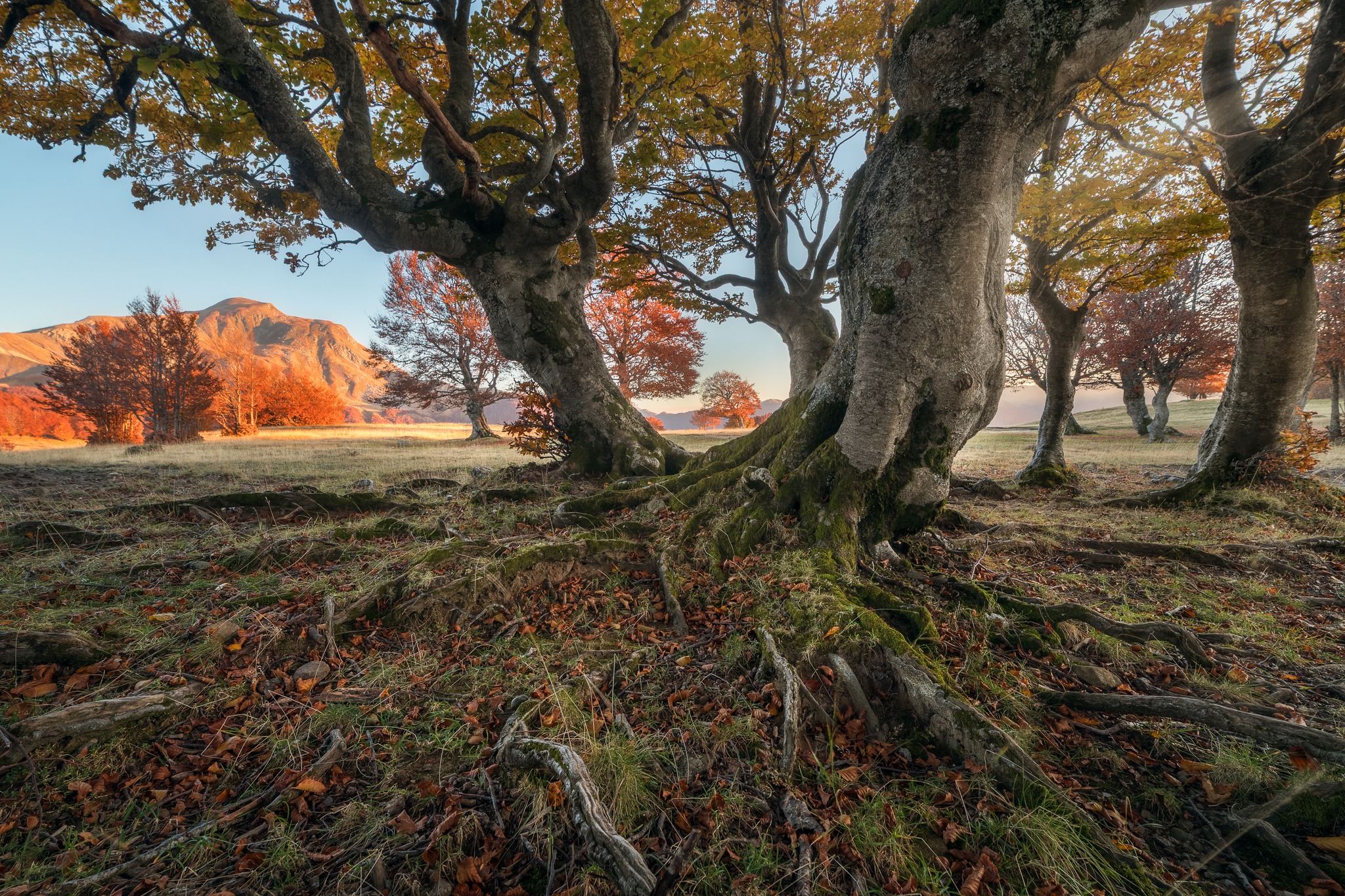 Le grandi chiome del faggio in un'area aperta come i Prati di Sara sono esposte a venti forti e costanti. Per resistere a questa pressione e non essere sradicati, gli alberi devono ancorarsi saldamente. Le radici si ingrossano e si sviluppano in modo massiccio, spesso a "piede d'elefante" o a contrafforte, per dare stabilità.