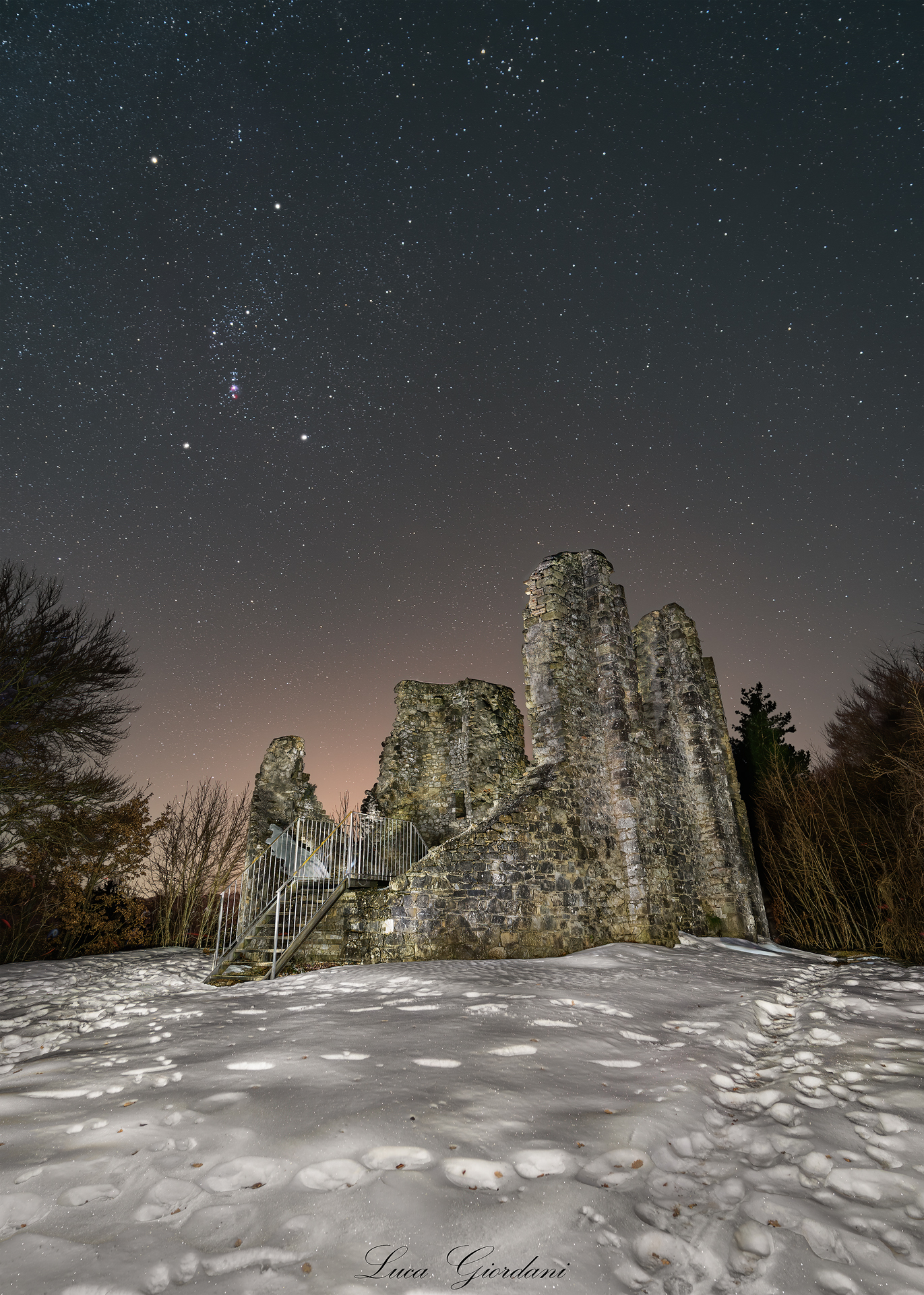 La foto unisce storia e astronomia in modo suggestivo: le antiche mura del Fortino di Sparavalle guardano il cielo stellato, come se la natura e l’uomo si incontrassero in un dialogo eterno. La Costellazione di Orione, con la sua Nebulosa, aggiunge profondità e mistero a questa immagine, ricordandoci quanto sia vasto e affascinante l’universo.