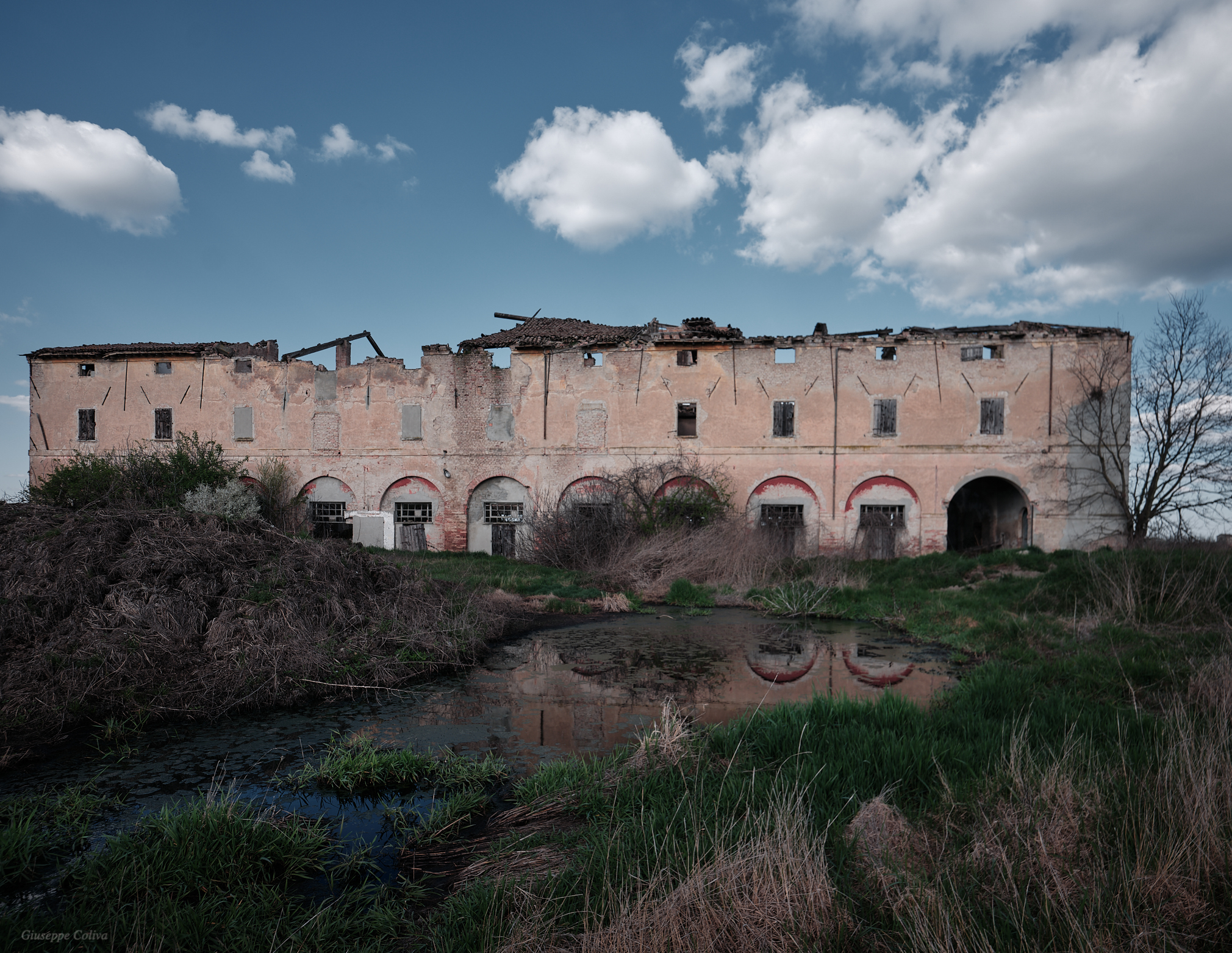 L’edificio, pur degradato, mostra ancora i tratti tipici delle grandi stalle del Novecento come: