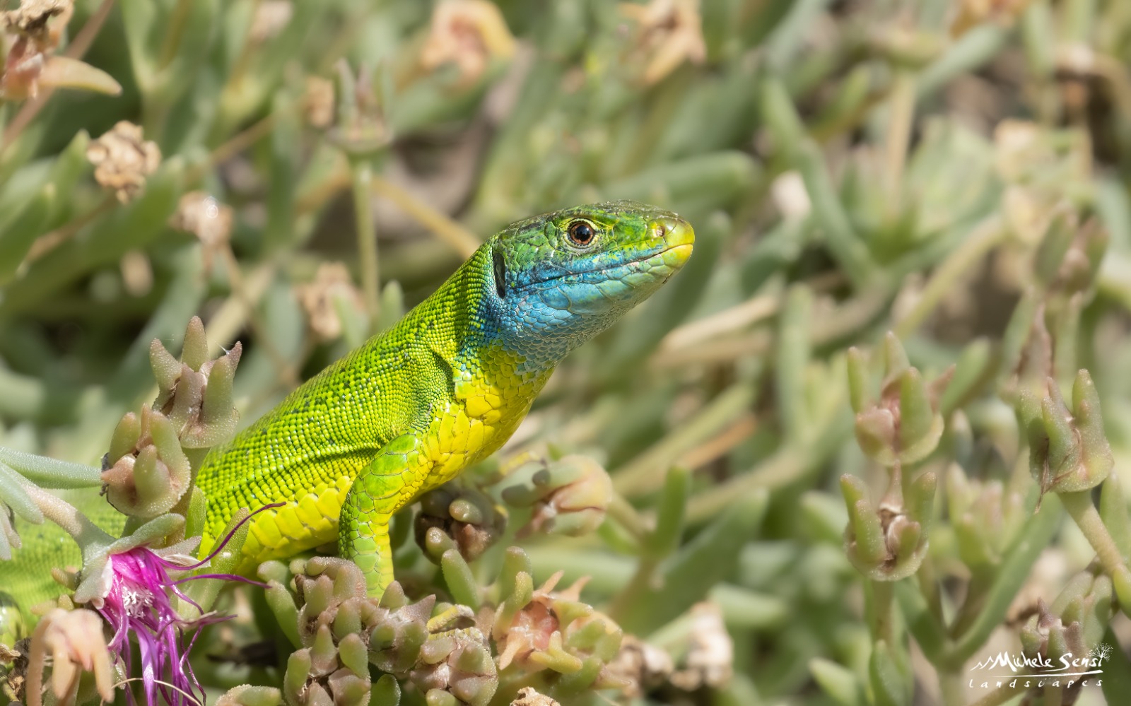 Con il suo inconfondibile colore verde acceso spaventa i più timorosi che vedendolo correre temono chissà quale aggressione da parte di questo Lacertide (è il nome della famiglia alla quale appertiene). Le dimensioni di questa lucertola sono di tutto riguardo ed alimentano lo spavento generale quando improvvisamente corrono tra i cespugli per scappare da noi. Può superare i 40 cm di lunghezza se comprendiamo la coda e vagamente ricorda le Iguana che vediamo in TV.