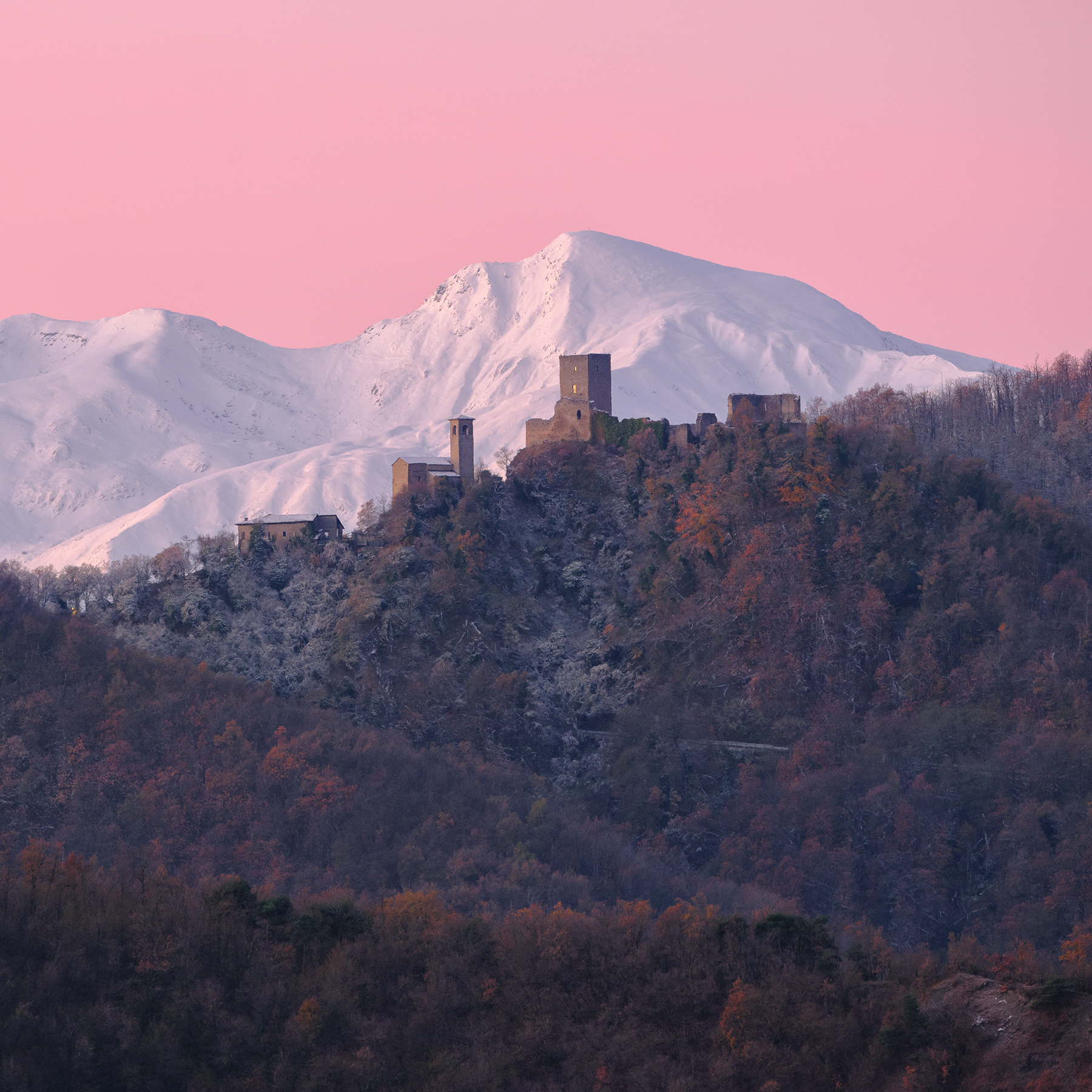 Incantevole scorcio del nostro territorio che si può osservare sulla strada che unisce San Giovanni di Querciola a Viano. Un angolo di strada che allinea perfettamente il naso del nostro "Gigante" al mitico Castello delle Carpinete.