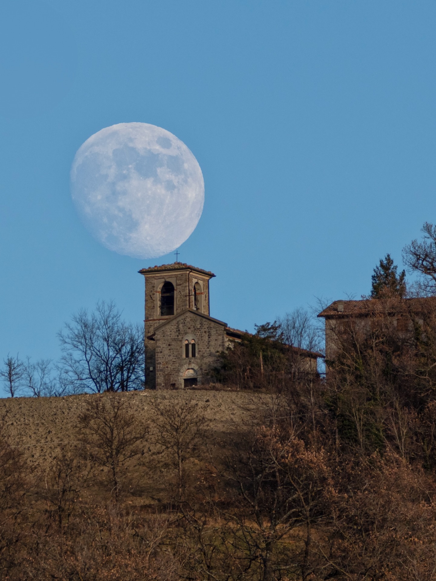 Con questo gioco di prospettive catturato da Rosetta Toni, ammiriamo una bellissima Luna alle spalle della chiesa di Sant'Apollinare di Ginepreto.